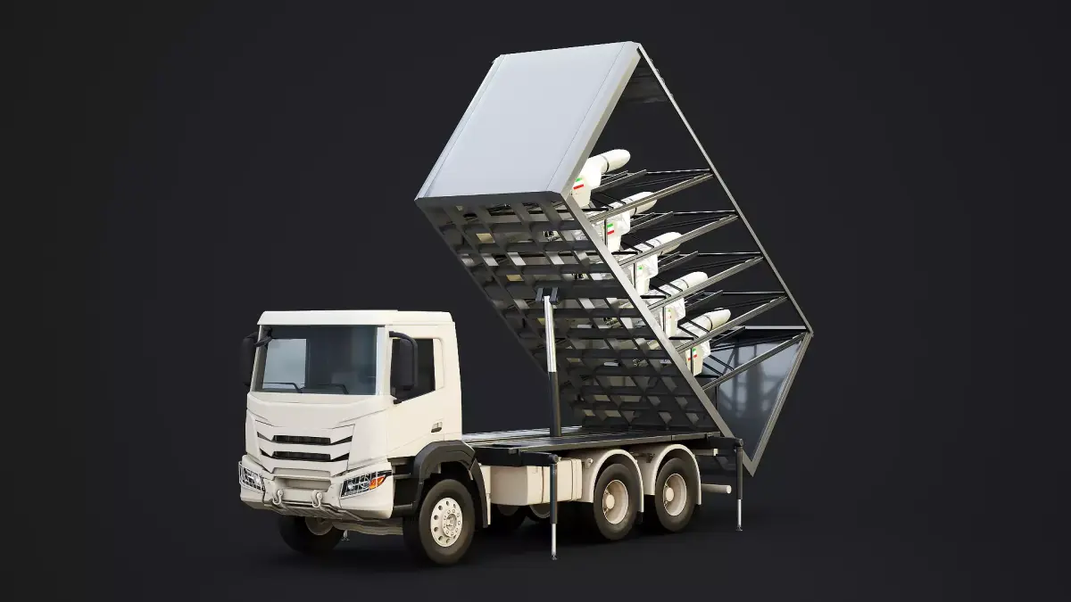 This high-quality 3D model represents a Shahed-136 drone launcher truck, built as a realistic and detailed military UAV launch platform. The asset includes a tilting container rack system equipped with multiple drone launch rails, modeled with accurate proportions and clean topology.