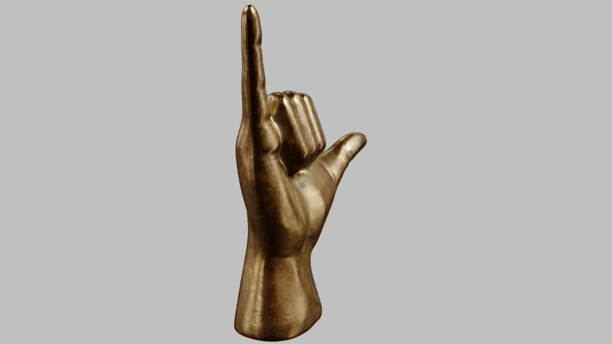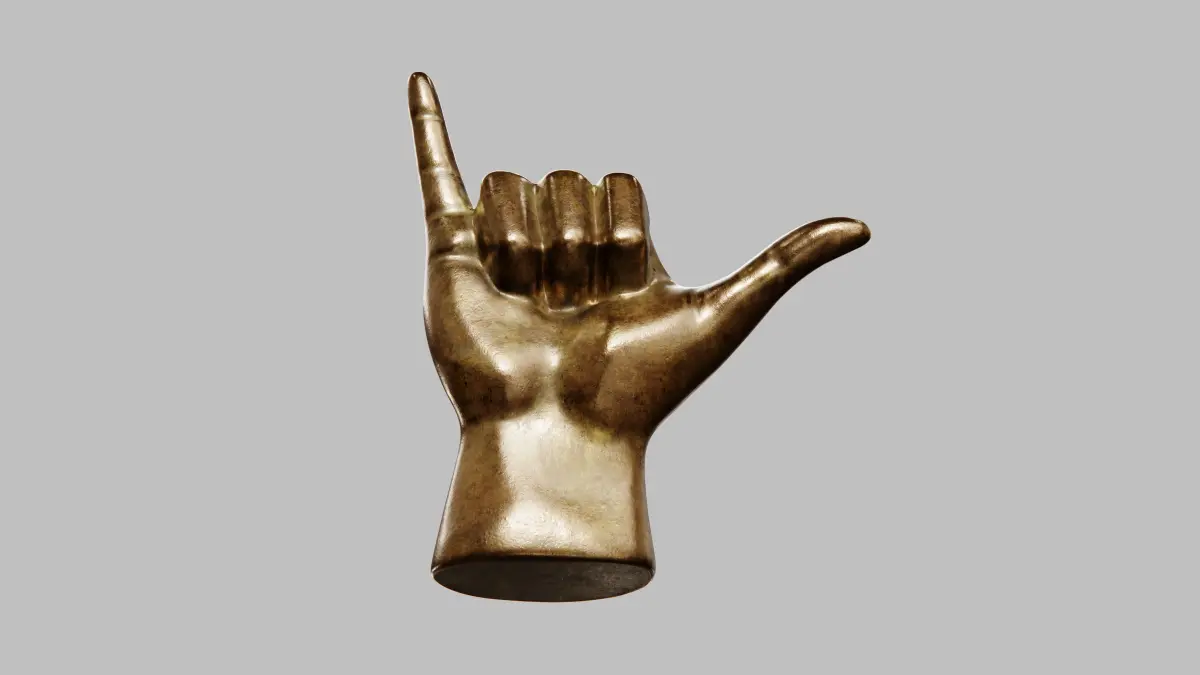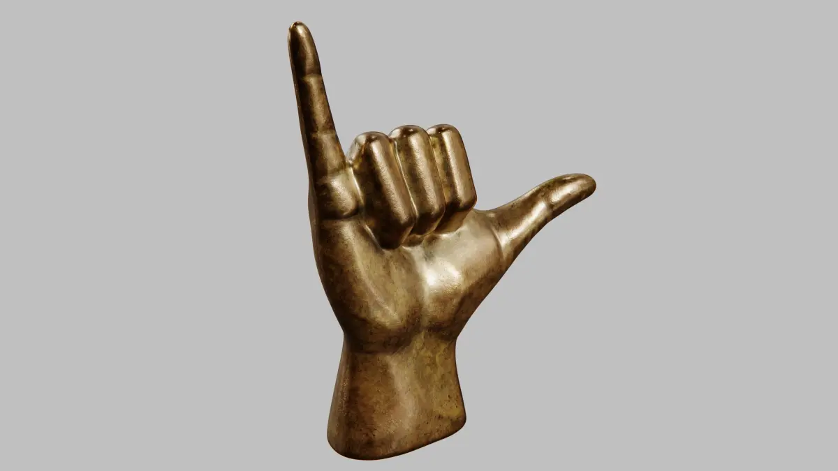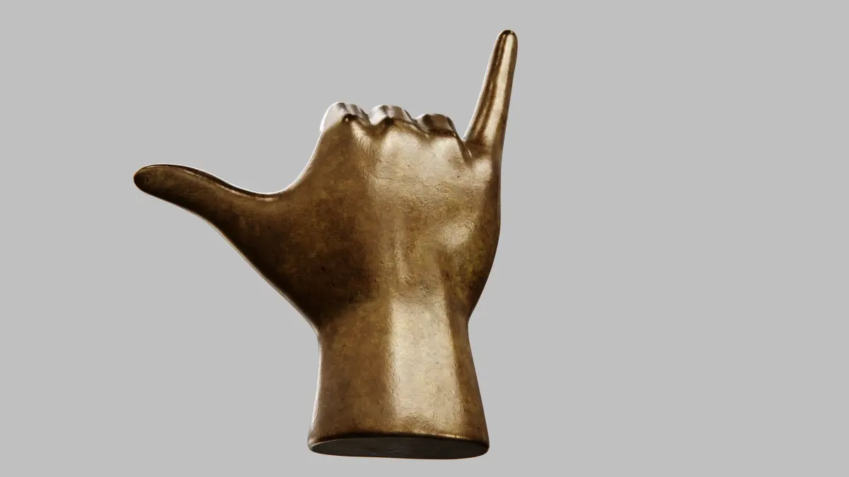 This is a 3D model of a hand sculpture displaying the Shaka sign. The model features quad topology, is fully UVW mapped, and includes 8K texture maps, depicting a metallic finish. It is suitable for interior visualization and decorative purposes. Multiple file formats are provided: .max, .obj, .fbx, .abc, and more.