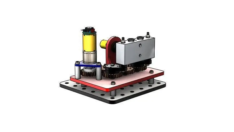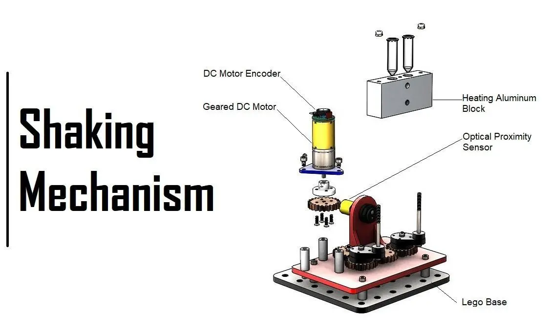 The shaking mechanism is based on the 4 linkages mechanism, The geared DC motor drives the spur gears to rotate in a certain direction and a certain speed controlled through the DC motor encoder.