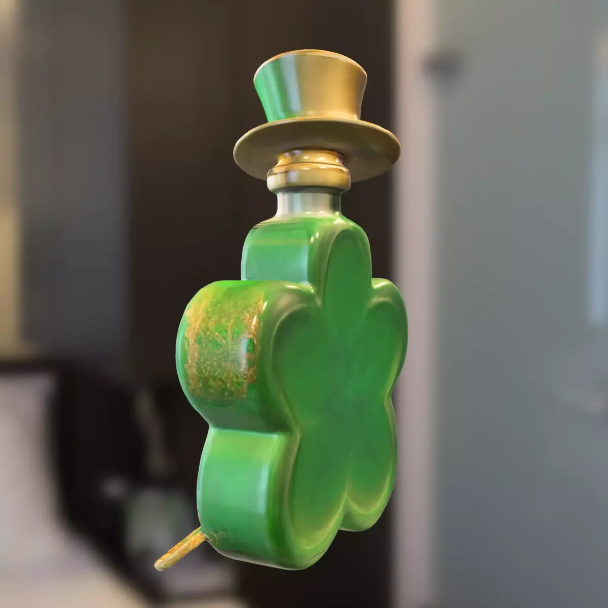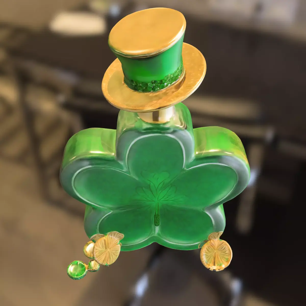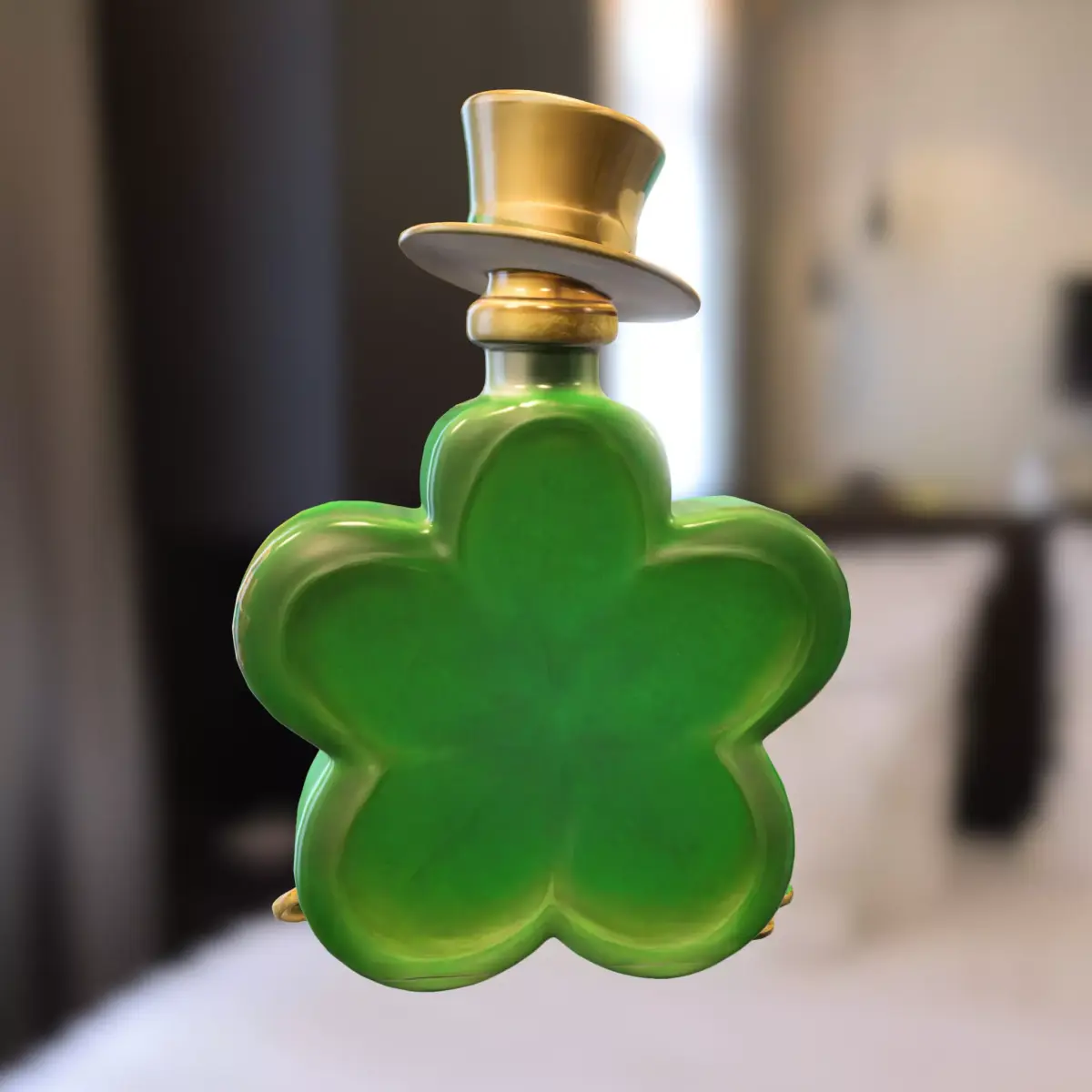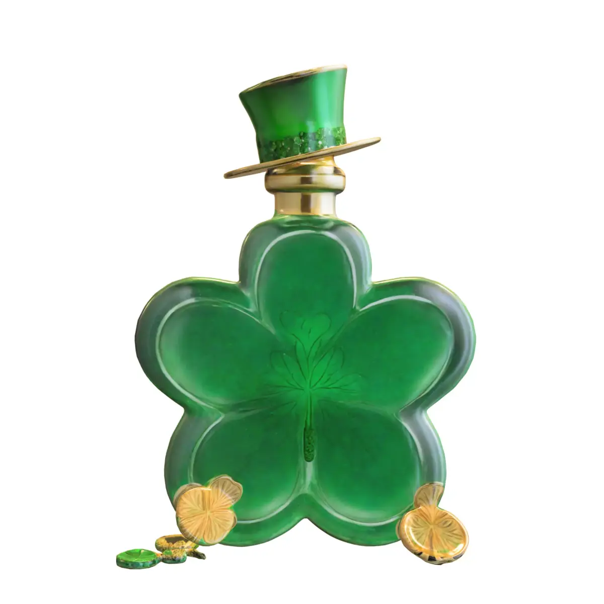 A detailed 3D model of a shamrock-shaped potion bottle, featuring a rich emerald green glass design, engraved clover details, and a whimsical leprechaun-style top hat. Ideal for fantasy, magic, or seasonal themes in popular games such as World of Warcraft, Skyrim, The Sims, VRChat, and Fortnite Creative. This versatile asset can be used as a collectible item, decorative prop, or magical object in game environments. Provided in multiple formats (OBJ, FBX, STL, DAE, PLY, GLB, Blender) for seamless integration into various 3D software and game engines. Also suitable for high-quality 3D printing for themed decorations or cosplay props.