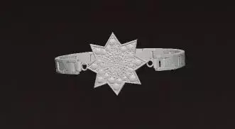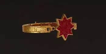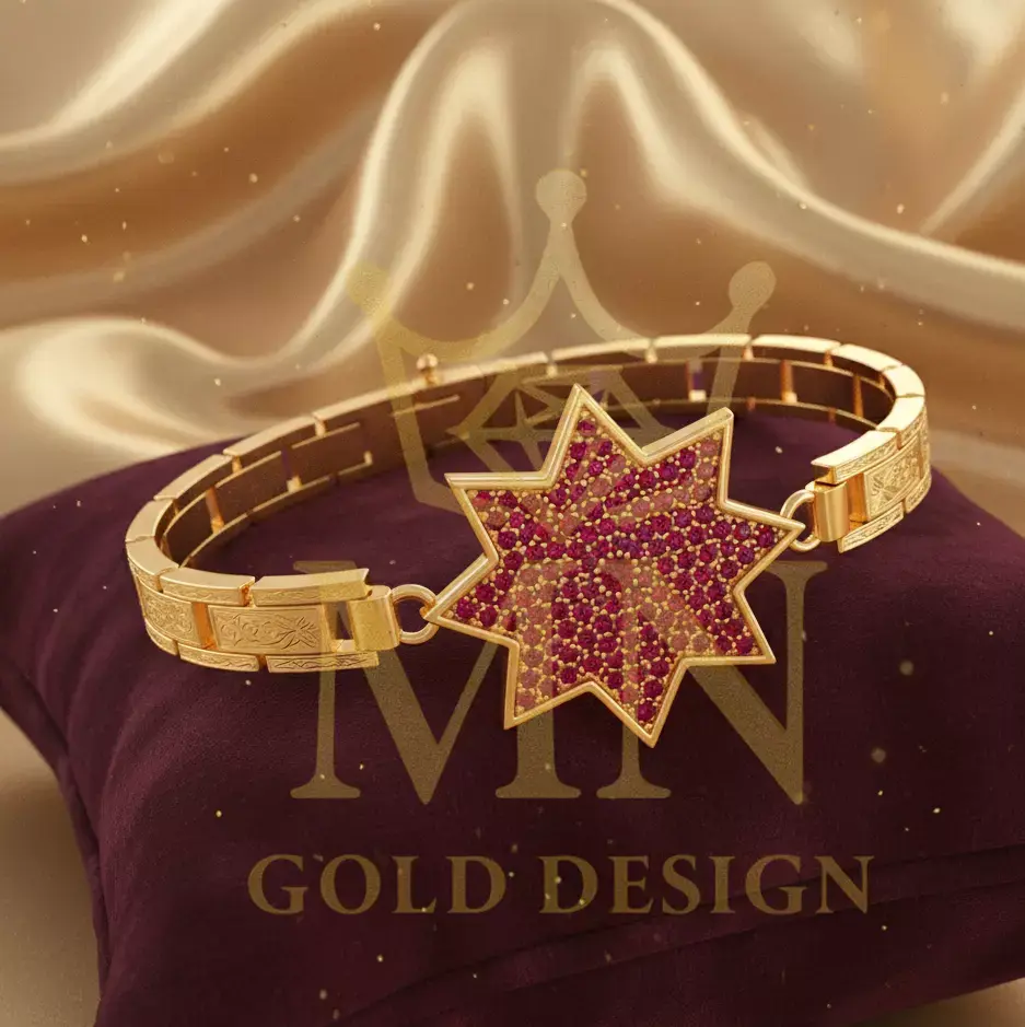 The Shams-e Zar bracelet is inspired by the Persian eight-pointed sun symbol; a symbol of power, light, splendor and eternity. The center of the bracelet is covered with brilliant red gems that enhance the sense of nobility and warmth of gold and, along with the geometric and regular structure of the body, showcases a perfect combination of tradition and modernity.