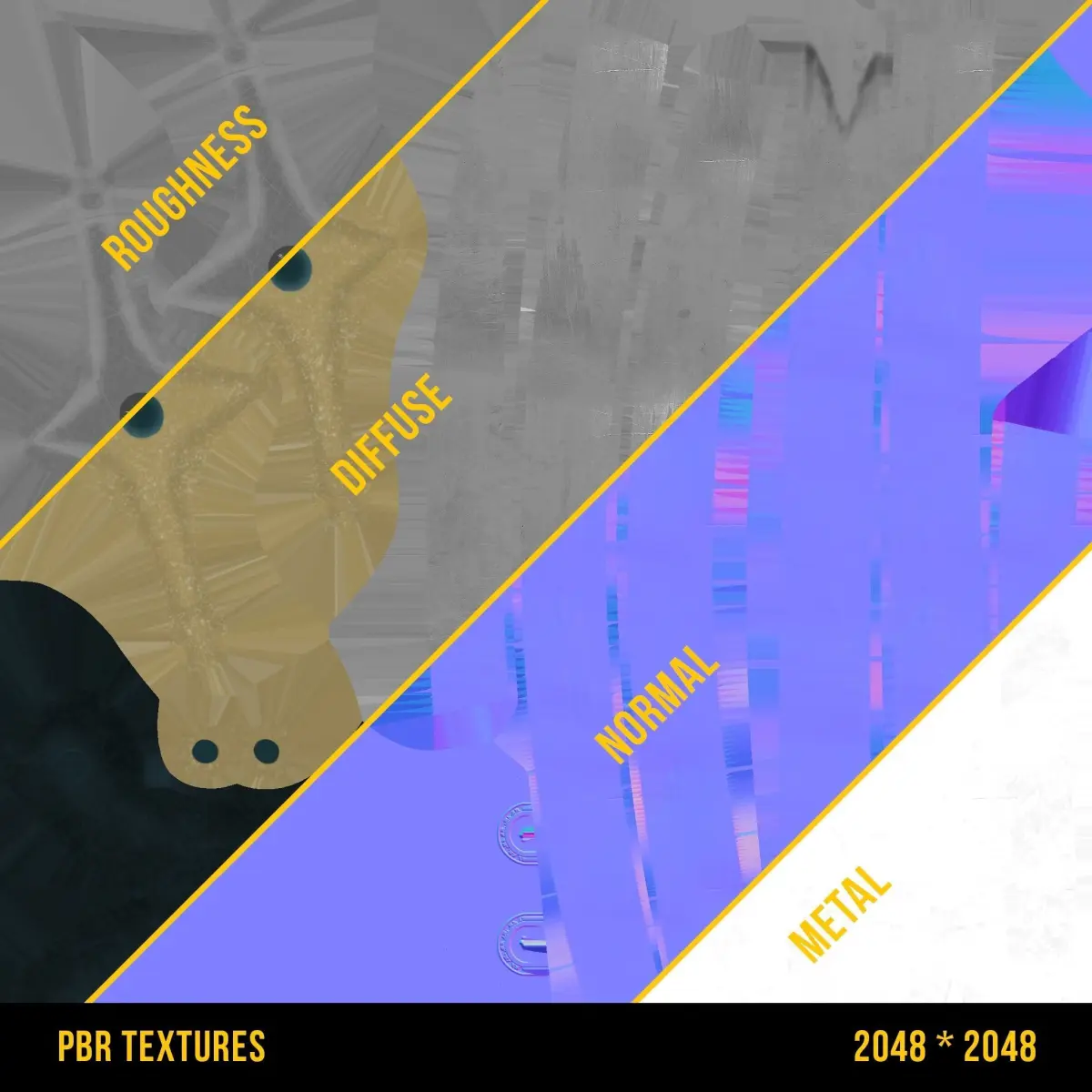- PBR Materials: Base colour, Roughness, Metal, Normal, Occlusion