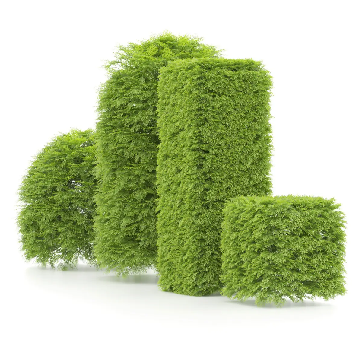Dimensions:bush 01 diameter: 125cm Height = 112cmbush 02 diameter: 100cm Height = 180cmbush 03 62cm x 62 cm Height = 155cmbush 04 60cm x 60cm Height = 67cm