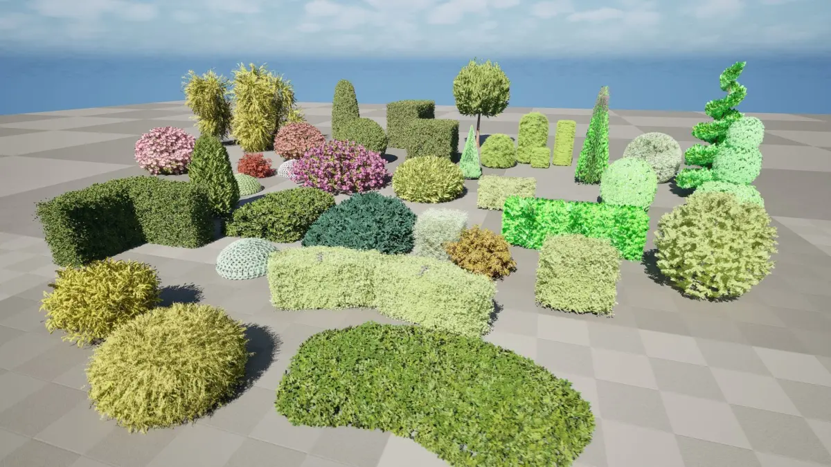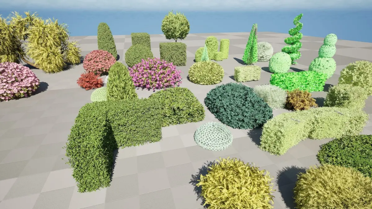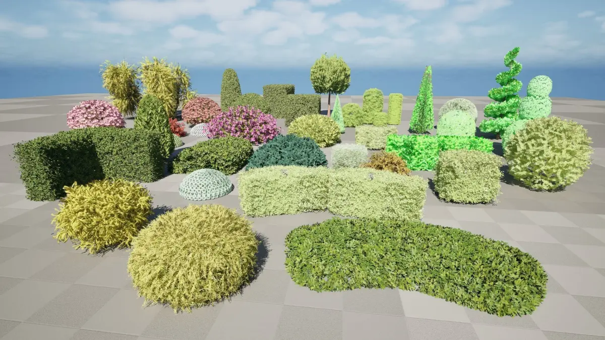 Enhance your 3D environments with HQ Plants Vol. 9: Diverse Shaped Bushes & Hedges, a versatile pack containing a wide variety of sculpted and natural-looking bush and hedge models. This collection offers a diverse range of shapes, from classic topiary forms like spheres, cones, and cubes (reminiscent of boxwood and yew), to more organic and free-flowing designs, some resembling hydrangea or other flowering shrubs. Whether you're creating a formal garden, a natural landscape, or an urban setting, this pack has the perfect greenery to bring your scene to life.