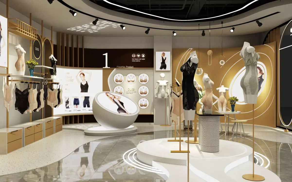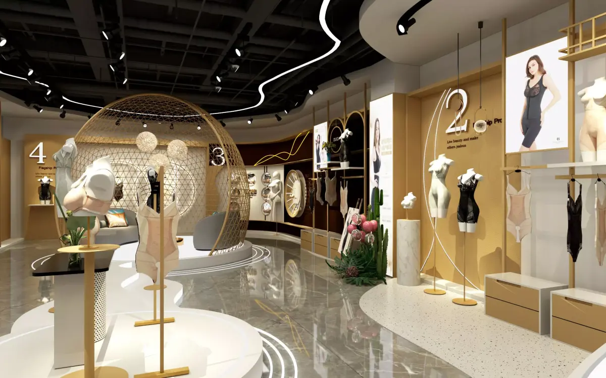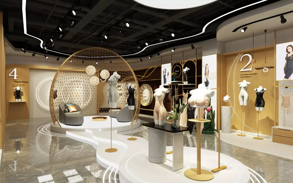 This is a women's shapewear boutique, featuring a light luxury and elegant style with gold, white and dark brown as main colors, marble-textured floors and metal line decorations, perfectly matching its brand appeal of exquisite shaping, quality life.