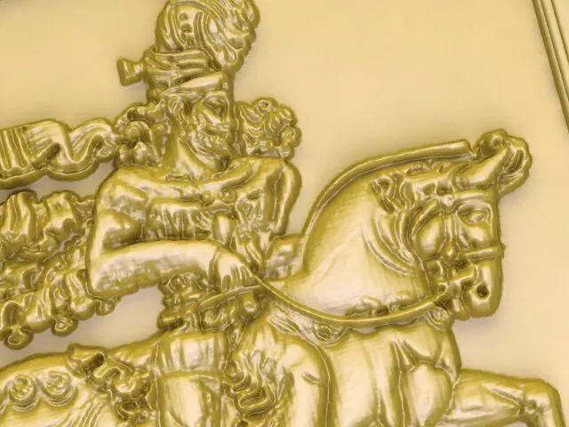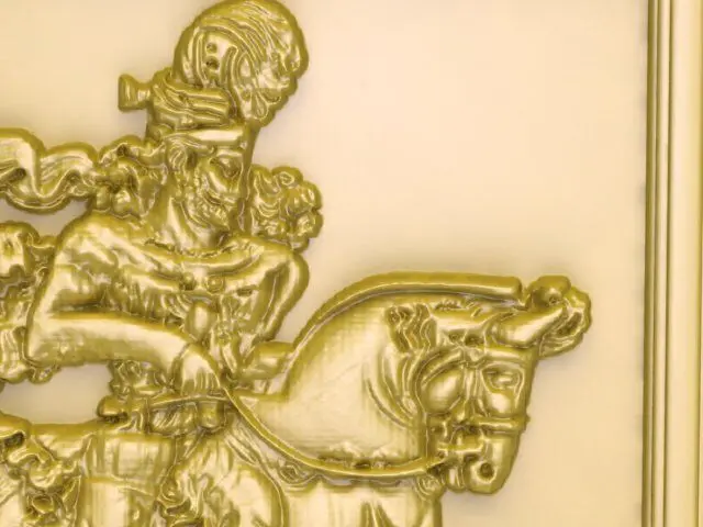 This relief sculpture, inspired by the grandeur of Sasanian art, portrays a peerless portrait of Shapur I mounted on a winged horse, emerging from a realm of light and shadow. The king’s serene yet commanding gaze, with a hand resting on his sword, symbolizes the power, wisdom, and authority of the Sasanian era. His horse, galloping fiercely, seems to shake the earth with every stride, narrating tales of Iran’s ancient triumphs.