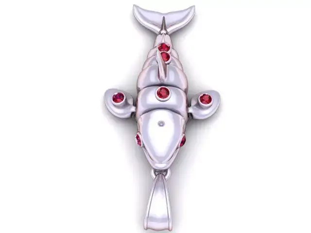This is a luxury shark pendant meticulously crafted in polished yellow gold, designed with dynamic curves to capture the strength and agility of the ocean predator. The piece is adorned with multiple ruby gemstones placed along the fins, eyes, and body segments, adding a fierce and striking contrast to the golden finish. This pendant is both a symbol of power, resilience, and freedom, and a bold fashion statement for ocean lovers, adventurers, and jewelry collectors.