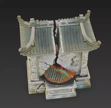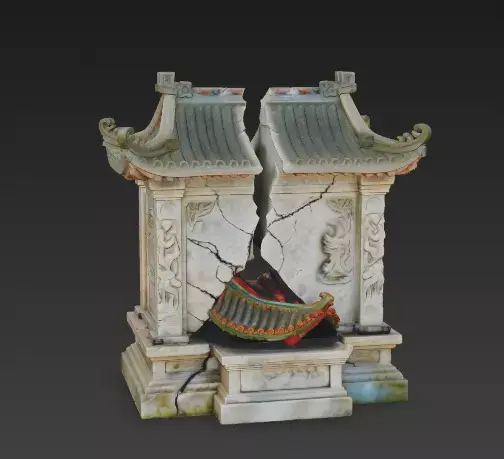 The Overall Concept This is a piece of environmental storytelling for an ancient or fantasy setting. It represents a forgotten roadside shrine or a small spirit house that has been destroyed by time, an earthquake, or a magical battle.