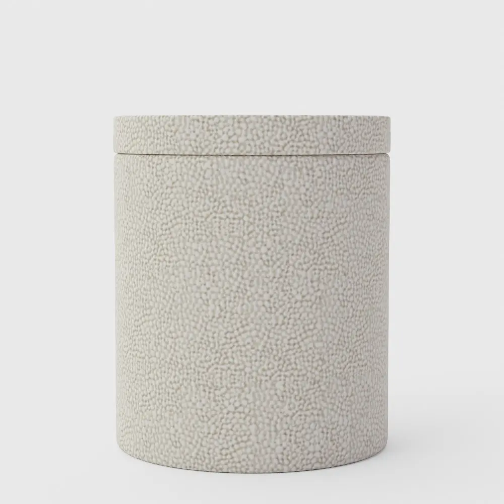 This is a high-quality, photorealistic 3D model of the Shaw Shagreen Ivory Canister, created in Blender. This elegant decorative storage piece features a faux shagreen (stingray skin) texture with a soft ivory tone and refined brass-finished accents. Ideal for luxurious interior scenes, bathroom vanities, or tabletop styling in digital design projects.