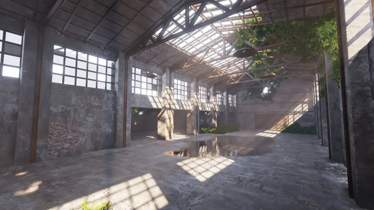 This product contains a fully rendered factory building with custom made texturepainted PBR floor and walls.