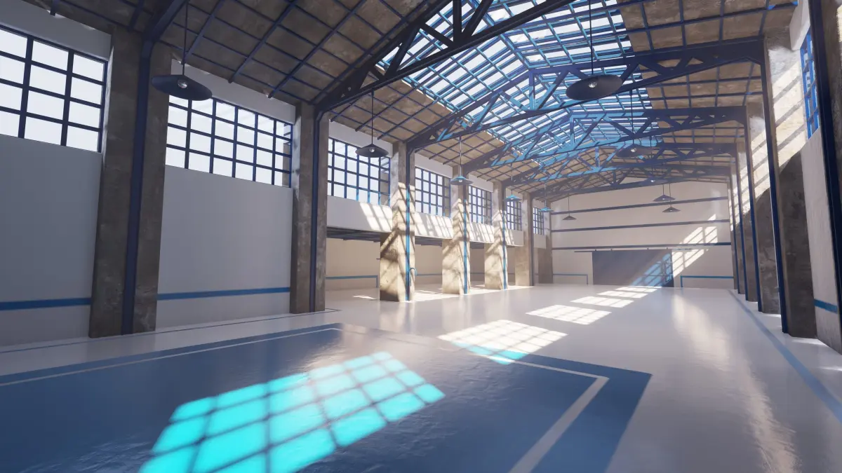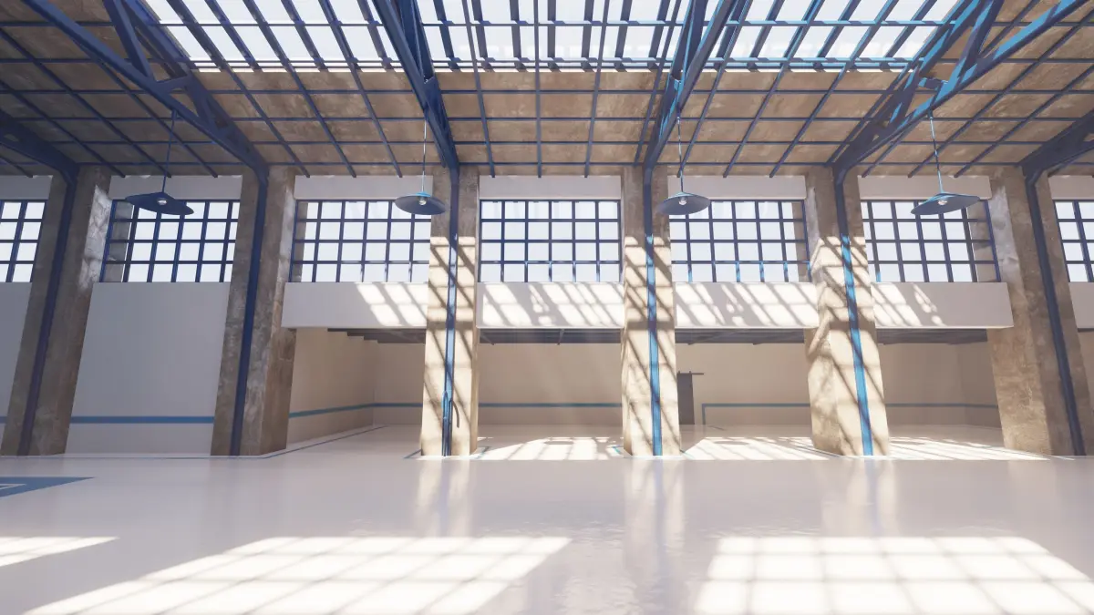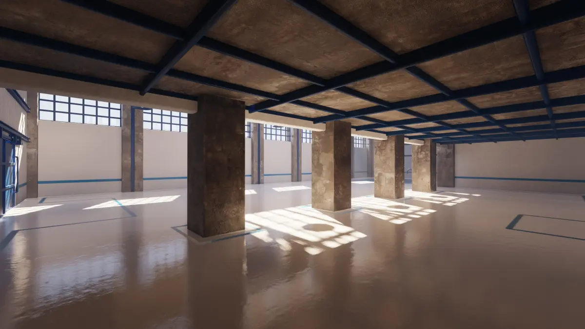 This product contains a fully rendered factory building with custom made texturepainted PBR floor and walls.