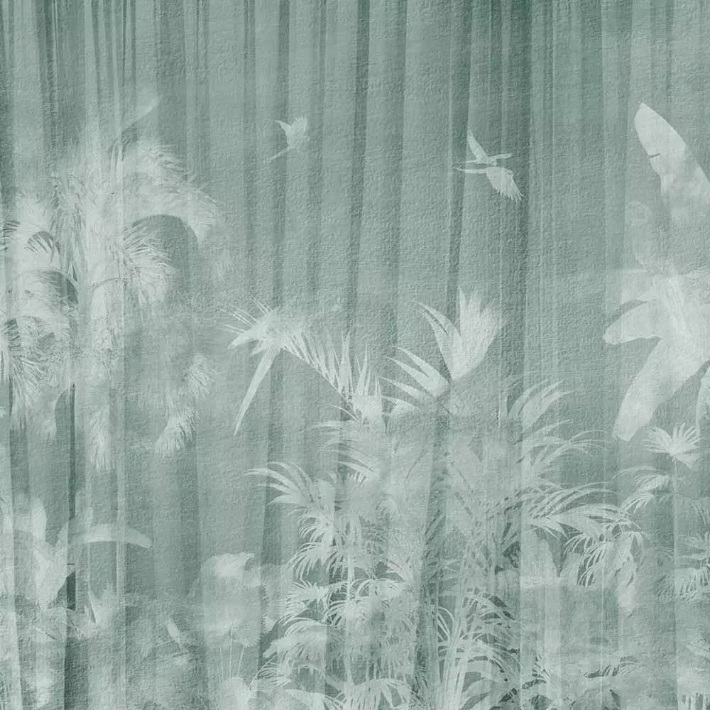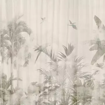 A tranquil palm grove emerges behind a soft curtain‑like veil with subtle parrots in flight, creating an ethereal backdrop that brings calm movement to living rooms, bedrooms, and spa‑inspired spaces . The layered mist, vertical voile stripes, and paper‑plaster texture add depth without visual noise, scaling elegantly for extra‑wide feature walls and CGI staging . Available in Light Linen, Mineral Sage, and Warm Sand tones, the set is optimized for seamless panel tiling and balanced contrast under ambient or spotlight lighting as shown in the lifestyle preview.