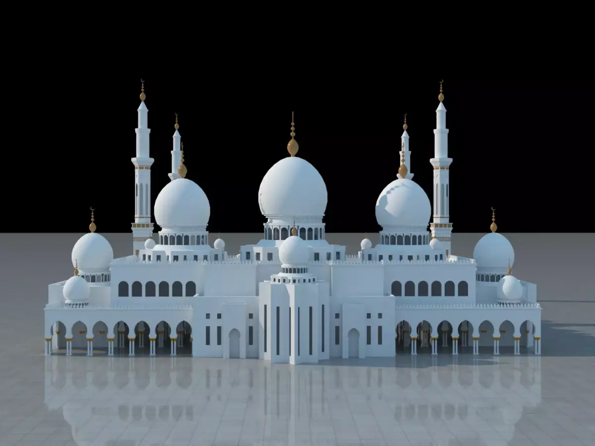 Highly detailed 3D model of the Sheikh Zayed Grand Mosque in Abu Dhabi, UAE.Features accurate architecture, white marble domes, intricate columns, chandeliers, courtyards.Optimized for architectural visualization, virtual tourism, games, and animations.