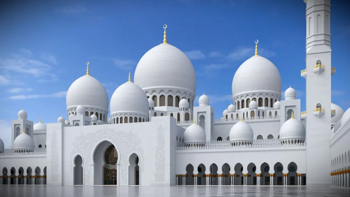 Sheikh Zayed Mosque Complex with Minarets and Domes White is a three-dimensional model of monumental Islamic architectural masterpiece located in Abu Dhabi, United Arab Emirates.
