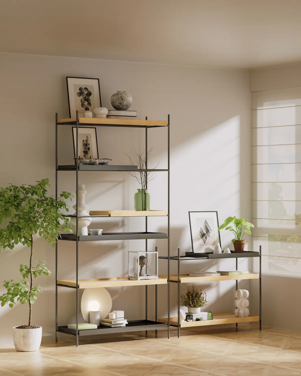 Shelf model iron frame floor-standing potted plant ornaments indoor sceneusing octane render.