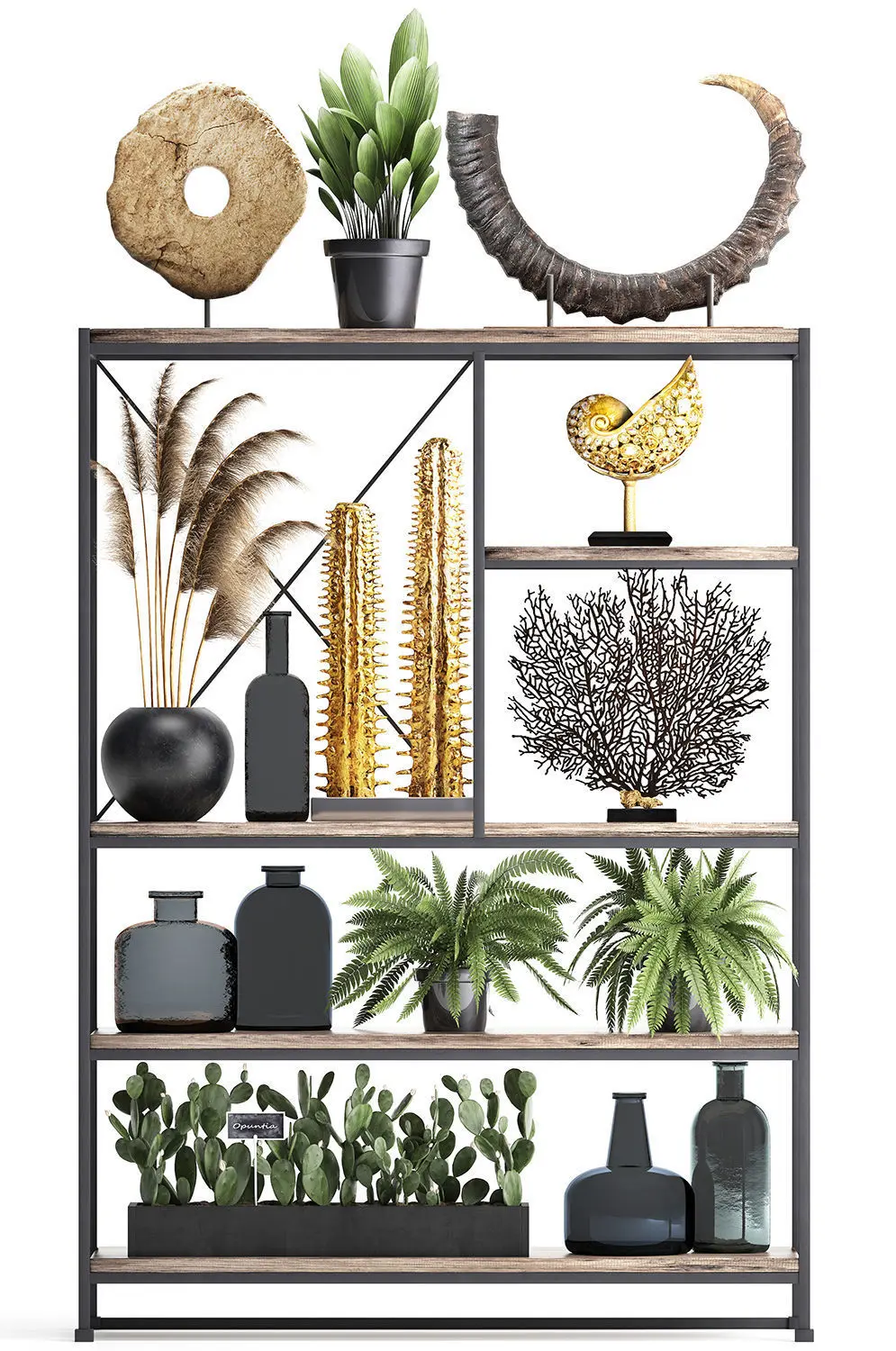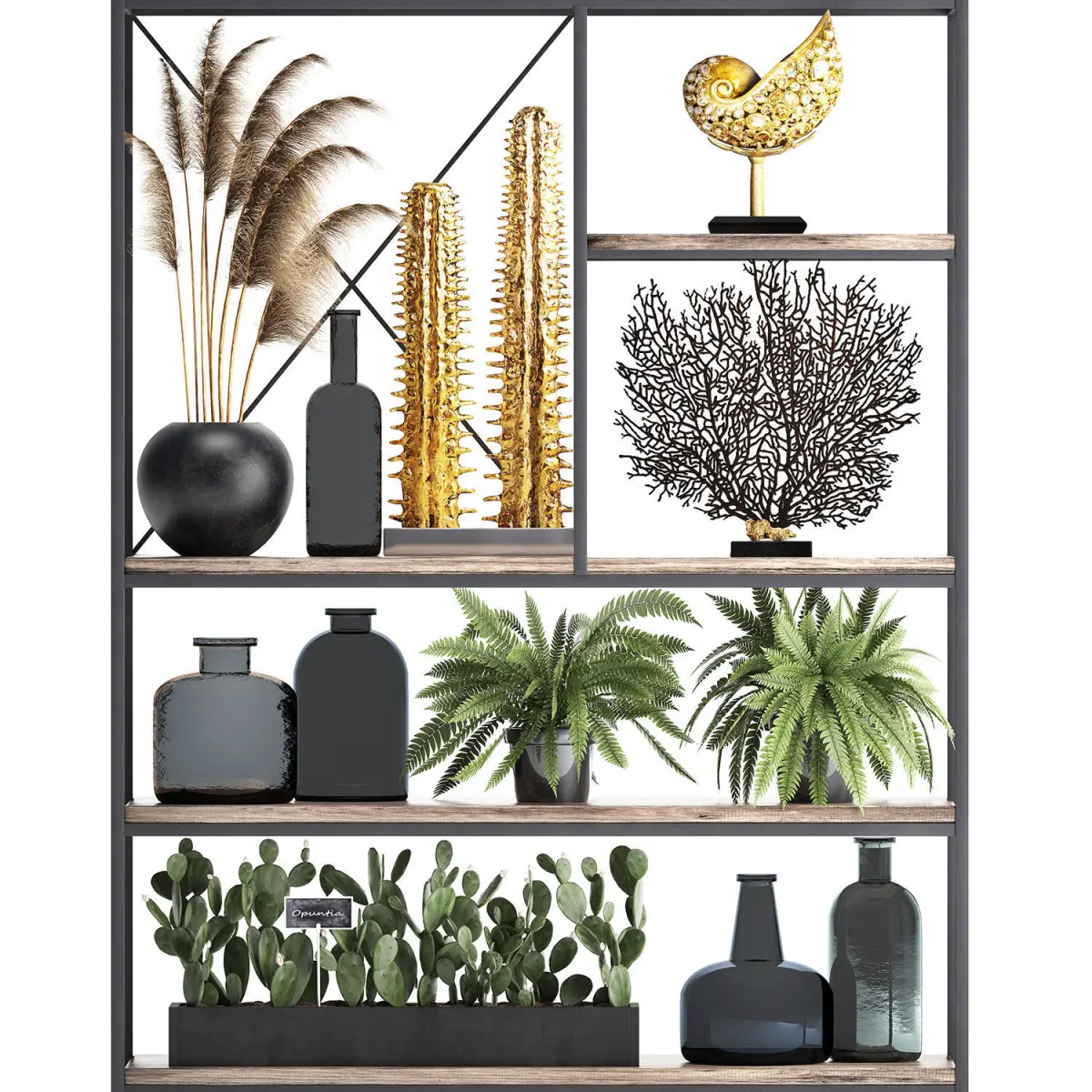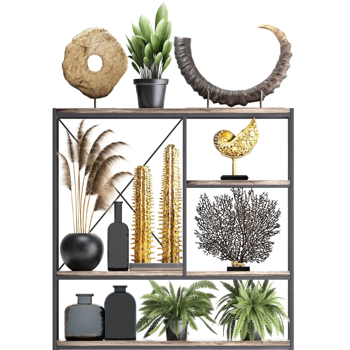 decorative set on a shelf with a coralcoralcoralsvasesshelvesBouquet of dried flowersCommon reedPhragmites australisDry reedsDry reedhorn, ammonite, cactus, fern, tusk, flower, pot, bush, shelving