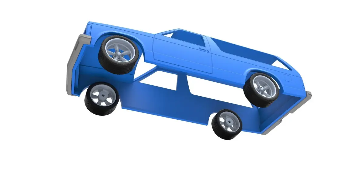 The model consists of parts: body, front bumper, rear bumper, rims, tires.