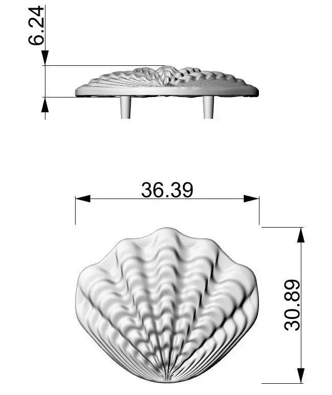 This is a 3D model of a shell-inspired shoe ornament, designed for production in metal and application on shoes or sandals. The design is elegant and organic, evoking the natural shape of a seashell, ideal for beachwear, summer footwear, or fashion-forward shoe collections.