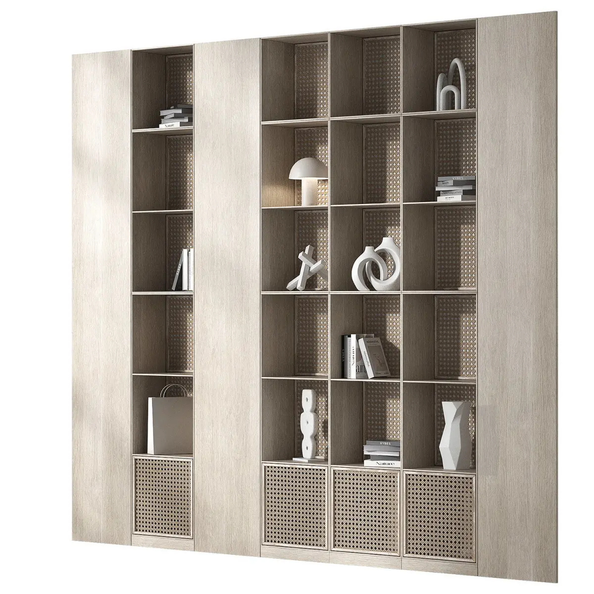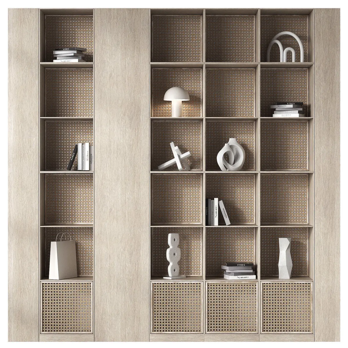 The 3D model contains designer shelving with decorative wicker inserts.The composition contains decor: ceramic vases, lamps, books, sculptures.With decor: 60000 polys.Without decoration: 30000 polys.The width of each rack is 40cm.Height from floor 250cm.The model is easy to edit to the desired size - each element is in a separate group.The weave is made with textures to make the model easier to edit.Suitable for styles: modern, minimalism, modern, scandinavian, eco, japandi.