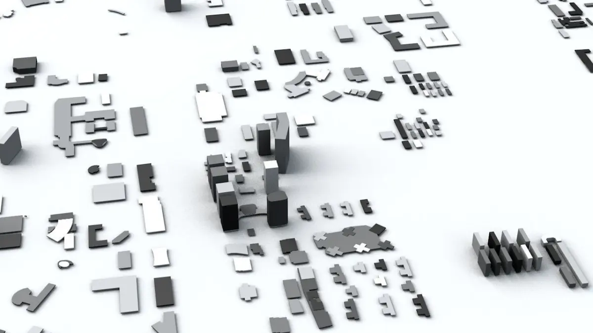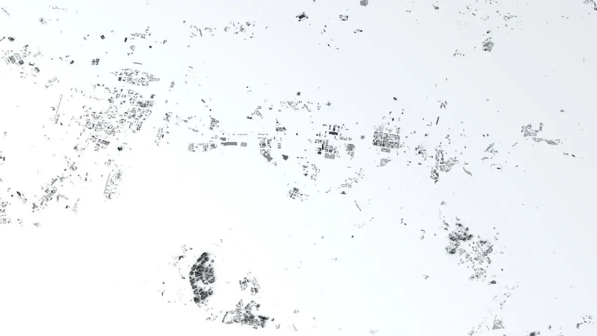 - the model is positioned on a flat surface (all buildings are on the “floor” - no elevation data included)
