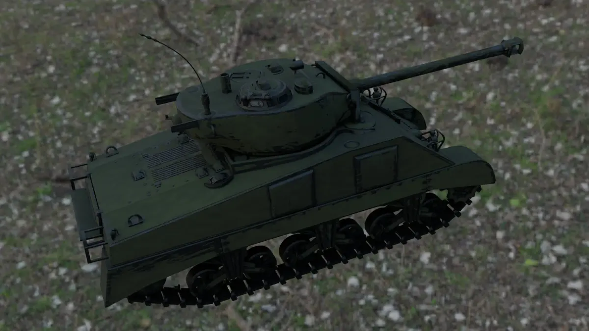 Tanque médio ShemanM4A2 de fabricação norte-americana que foi empregado na segunda guerra mundial , um tanque relativamente eficaz em combate mesmo não possuindo uma blindagem muito expeça , podendo variar entre 88 milímetros a frente da torre como variando também entre 63 milímetros nas partes frontais do chassi , está blindagem não muito eficiente era suprida com seu incrível canhão principal M1 de 76 milímetros , que por sua vez nocauteava a maioria dos blindados da época . Seu trabalho era mais eficiente como suporte para outros blindados pois por ter um canhão potente e uma blindagem razoãvel conseguir ter bastante mobilidade em áreas urbanas excelentes para caçar outros blindados. Modelo feito em escala para Unrreal 4 com uma texturização em 2k ,todos os pontos pivôs alinhados para a adição de osso .