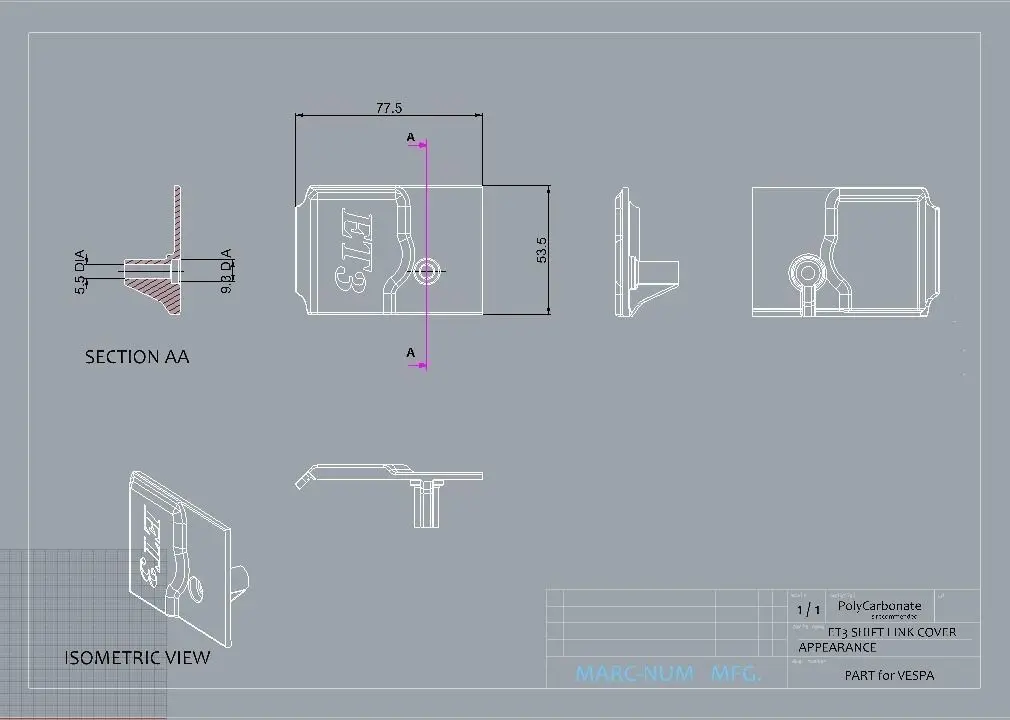 This is part for VESPA ET3 shift link cover. We recommend that you choose Polycarbonate as material.you need socket bolt of 30mm length.as concerned slice parameter, you can see in attached picture.We will accept your requests, questions,advices and so forth. Please E-mail to us.