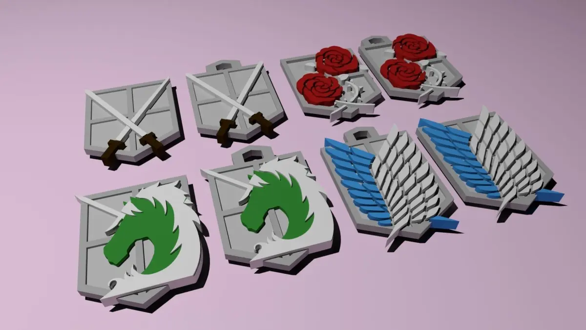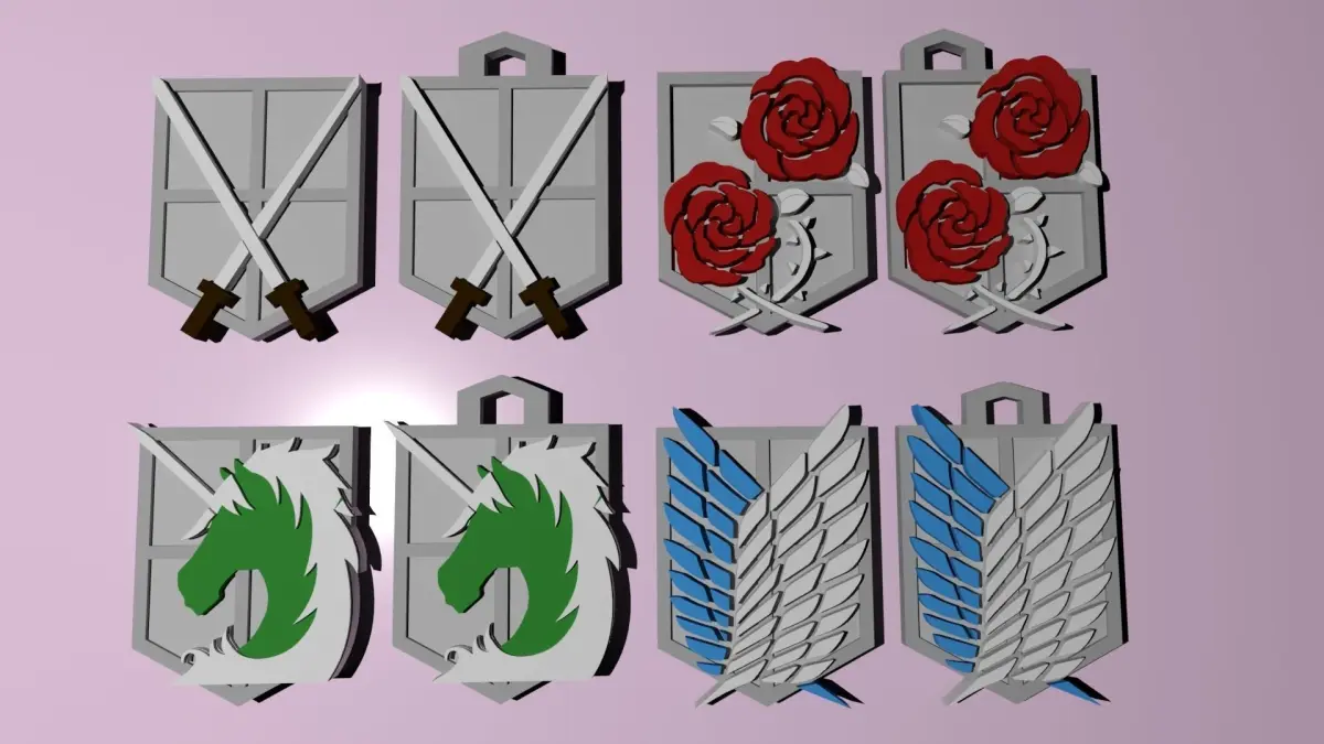 8 Available Meshes, 4 with keychain holes and 4 without.Survey Corps, The Garrison, The Training Corps, The military Police emblems from attack on titan (Shingeki no Kyojin) anime.