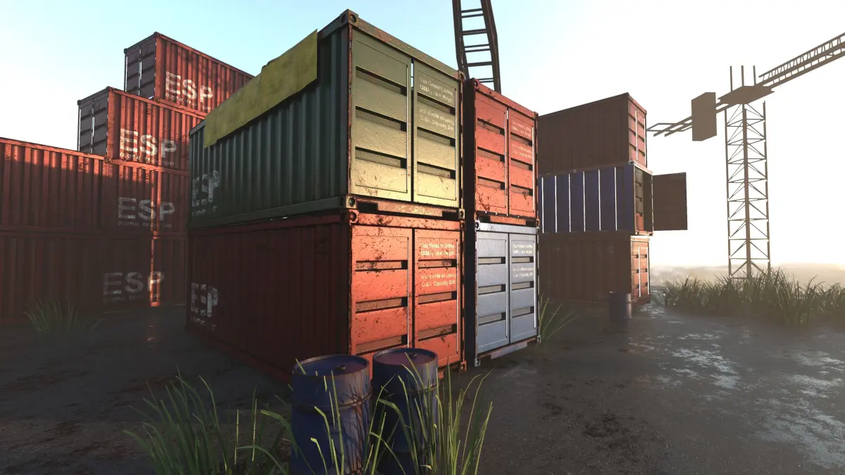 included within the ship yard 2 barrels 4 style ship containers including maps , crane, wet concrete texture , grass )includes the original substance painter files for custom edting includes marmoset render scene = 1 click load