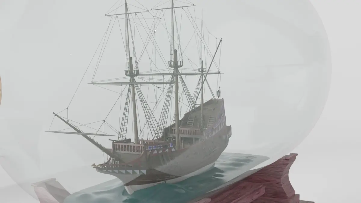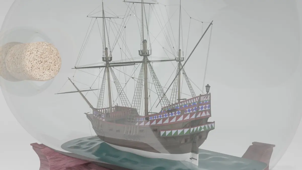 This is a detailed miniature replica of a historical galleon in a glass bottle. The vessel is largely based on the Golden Hind, the flagship of english navigator and explorer Francis Drake. The ship was used in his circumnavigation of the world. The model is fully unwrapped and textured. The textures are from Poly Haven and ambientCG.