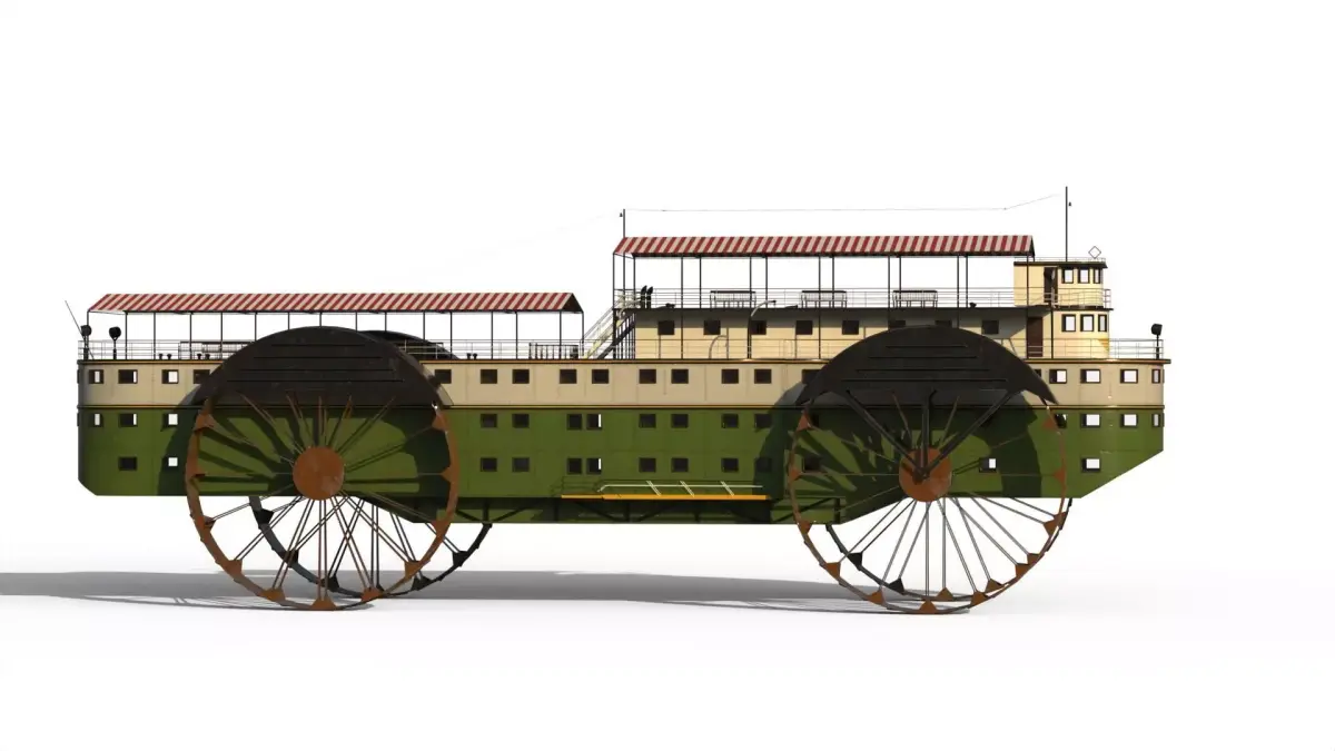 The Desert Ship (Wüstenschiff), 40 m long and 13.5 m long, 12 m wheels. powered by two large diesel engines and capable of carrying 300 passengers, in reality it is a liner on wheels to cross the Sahara.