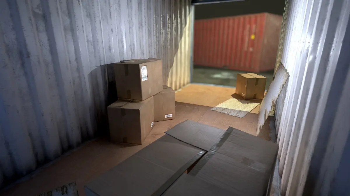 Realistic, low poly PBR shipping container with cardboard box and wood asset.