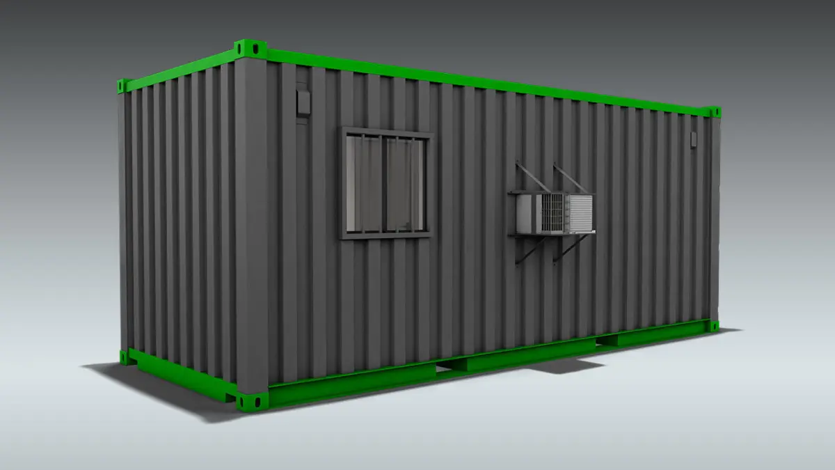 Highly detailed 3D model of a shipping container office or home, modeled and rendered in Cinema 4D. The model was created using approximate real world dimensions. The model contains a highly detailed LG though the wall air conditioner, a dual fluorescent light fixture, a switch and a socket.