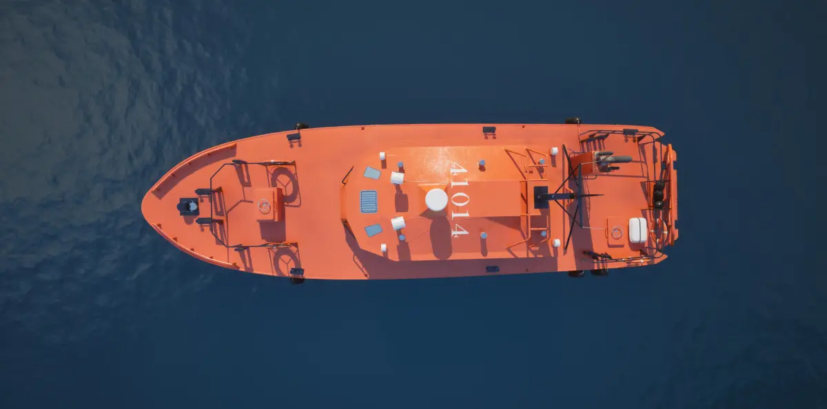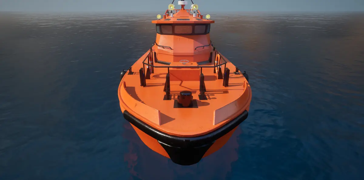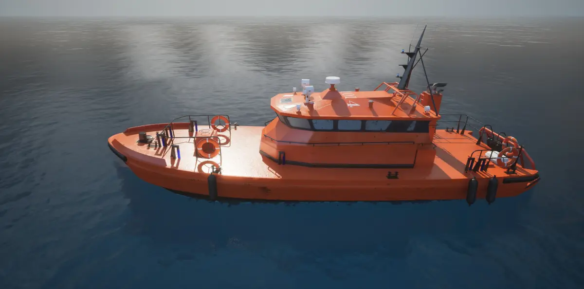The 3D model is a highly detailed exterior of a pilot boat with 52,000 polygons. It showcases a sleek, reinforced hull designed for durability and speed. The exterior features include lifebuoys, safety rails, antennas, and ropes. Realistic texturing provides weathered effects and metal finishes, with accurate UV mapping for high visual fidelity. Additional props include mooring lines and dockside equipment. The model focuses exclusively on the exterior, without an interior or pilot ladder.