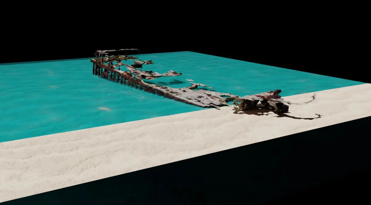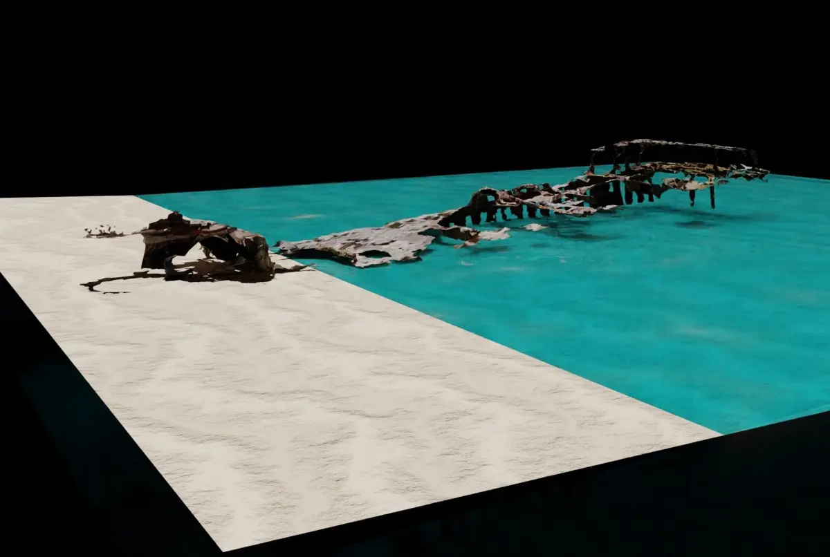 Shipwreck. Mesh and texture are photoscanned from a real shipwreck. Simple sand and water textures for Cycles/OptiX. 299k verts, 584k faces (tris). Native .blend set up for OptiX, and fbx, obj/mtl, dae, abc, usdc, ply, stl, x3d, and glb.