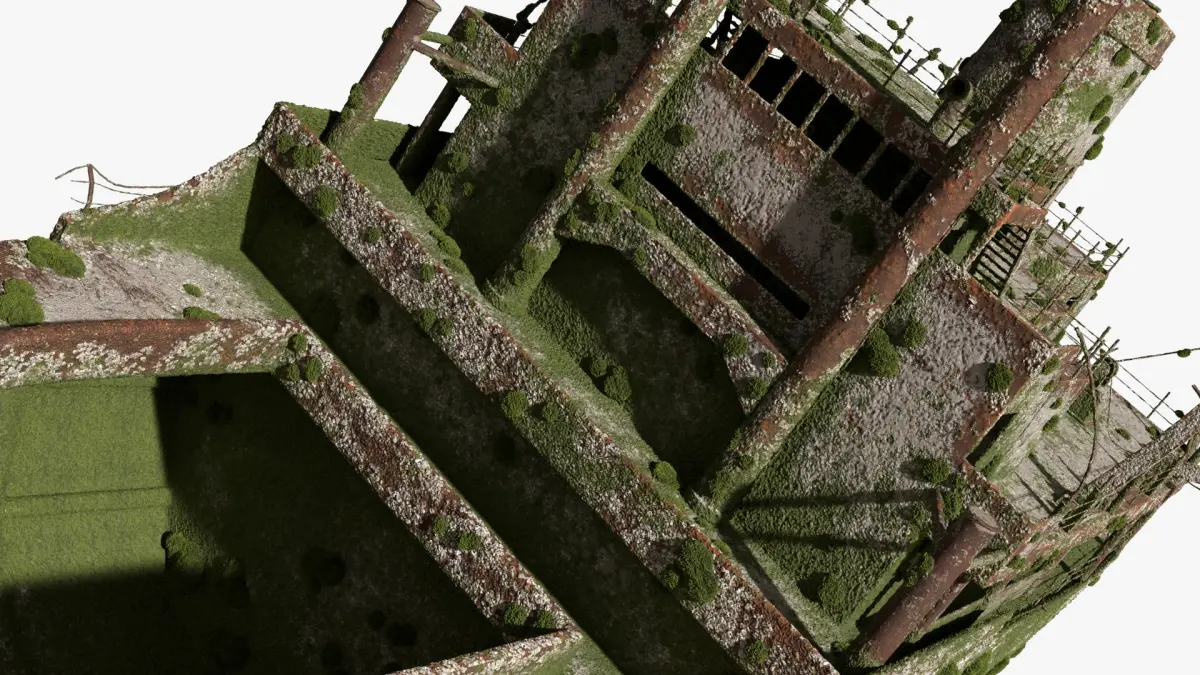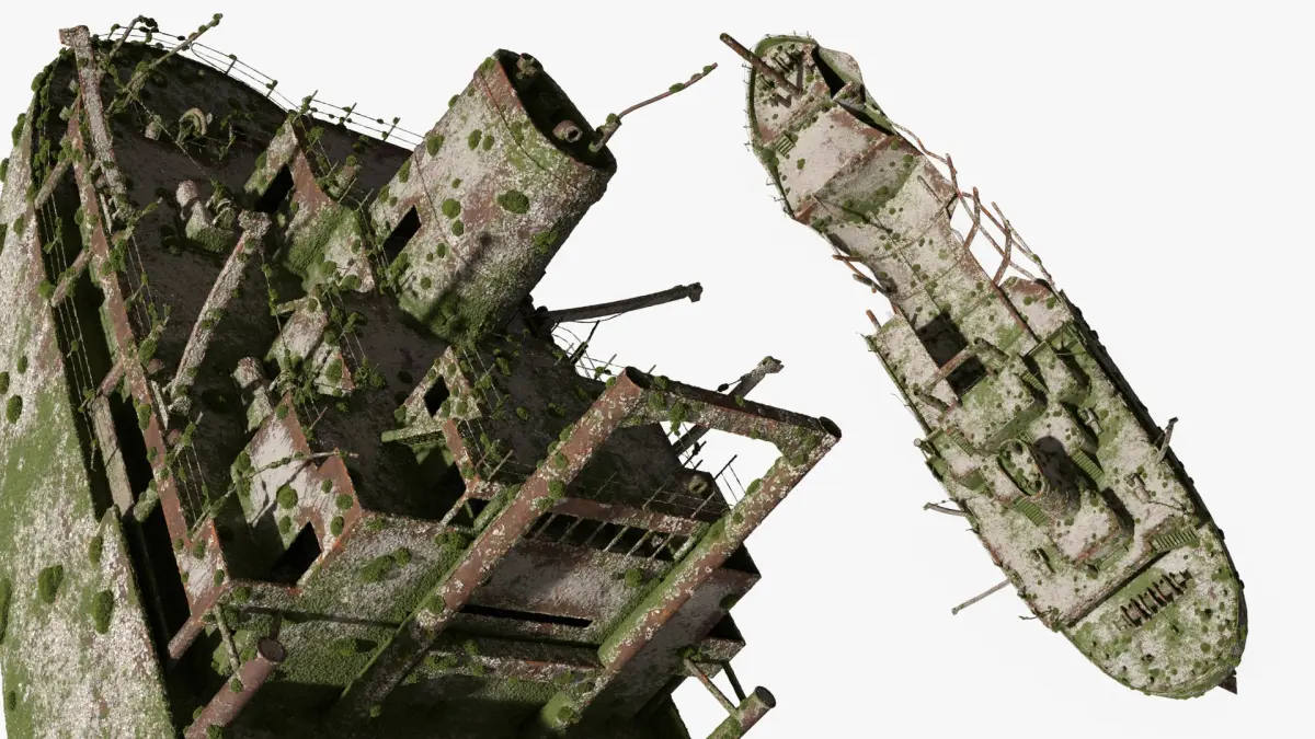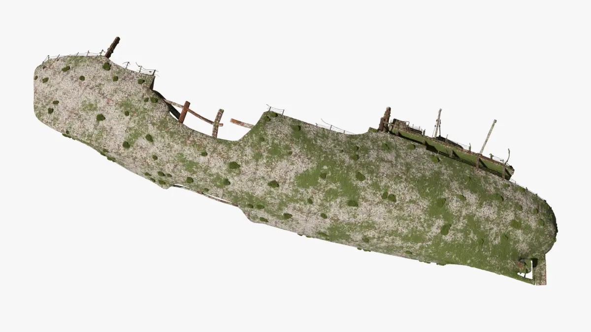 This model features intricate details like rusted metalwork, algae growth, and fragmented sections, giving it an authentic and aged appearance. The design captures the essence of abandonment, with corroded surfaces and structural decay that reflect years submerged underwater.
