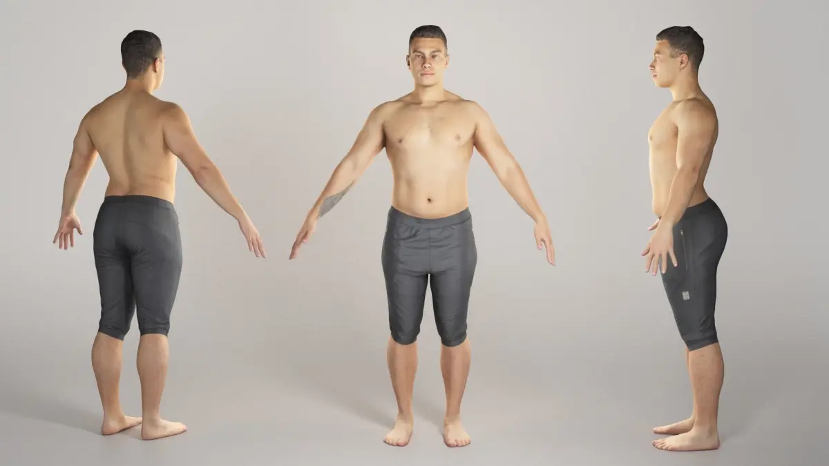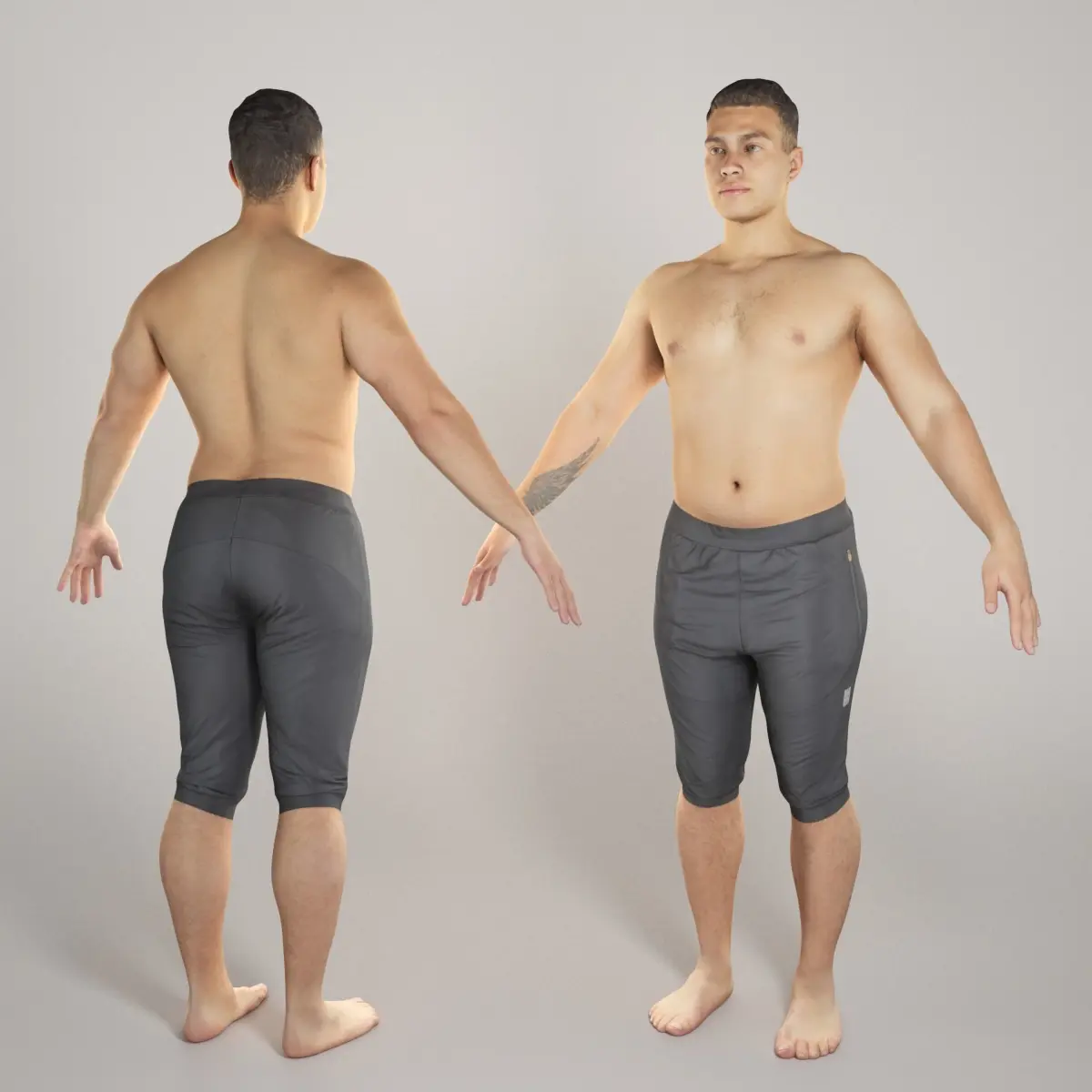 This is a true human size and detailed model of a young handsome man of Caucasian appearance dressed in black shorts. The model is captured in the A-pose with mesh ready for rigging and animation in all most usable 3d software.