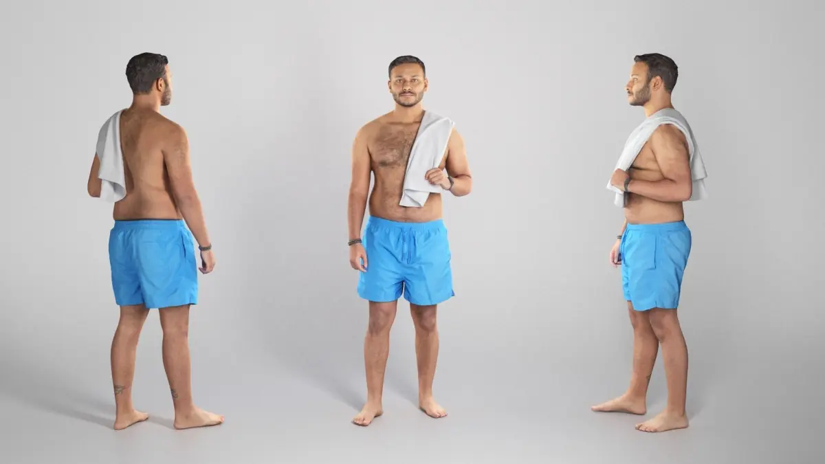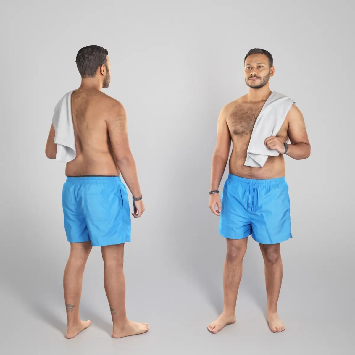 This is a true human size and detailed model of a sporty handsome young man of African appearance. The model is captured in casual pose to be perfectly matching for variety of architectural visualizations, e.g. beach, swimming pool, VR/AR content etc.