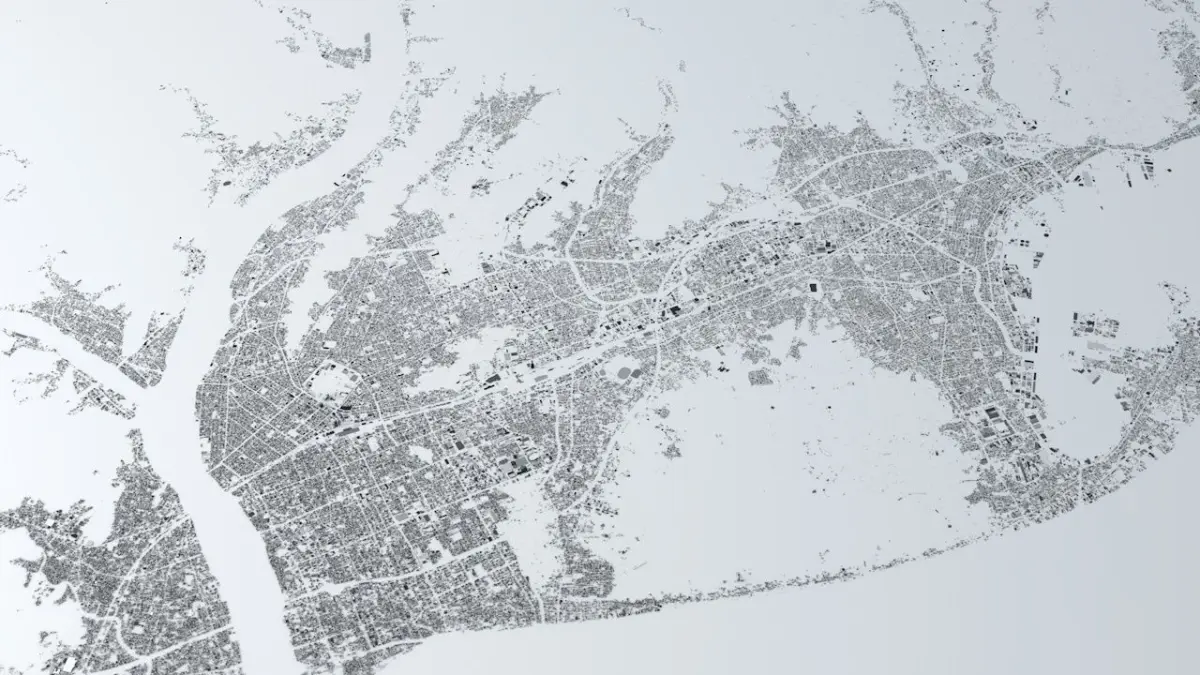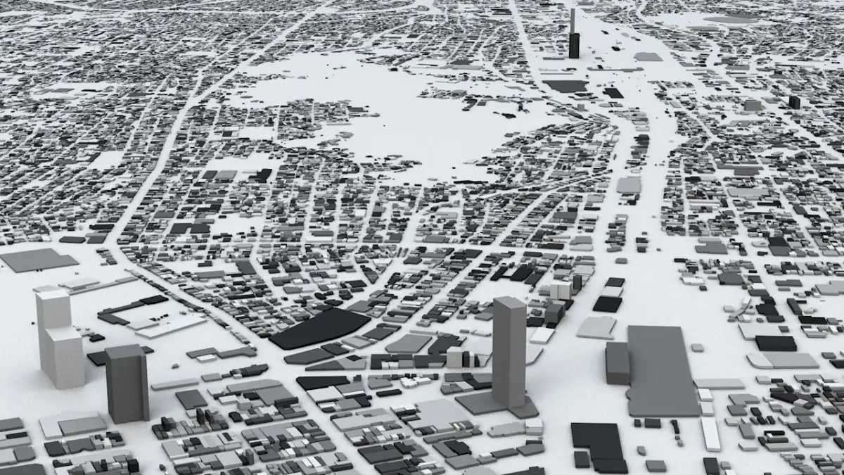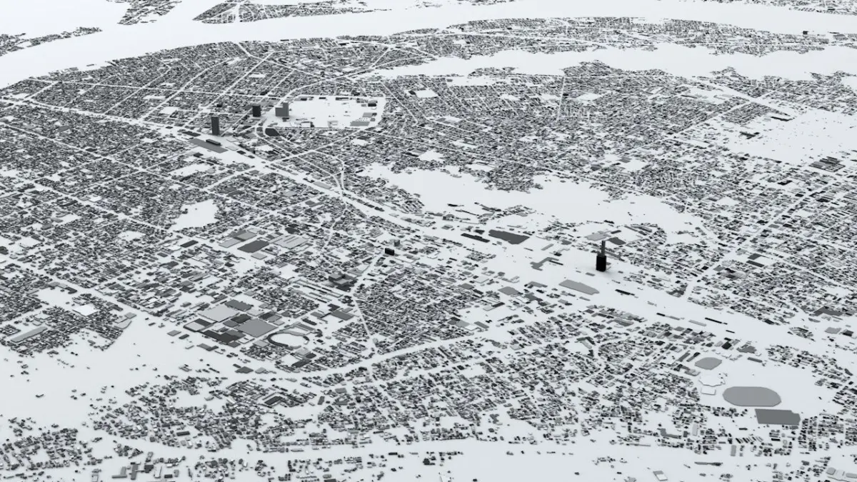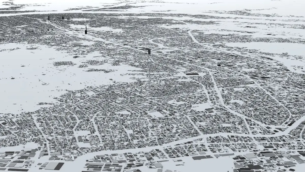- the model is positioned on a flat surface (all buildings are on the “floor” - no elevation data included)