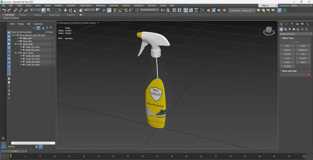 the spray model has 8 parts you can easily use any part you want for animation or change material.