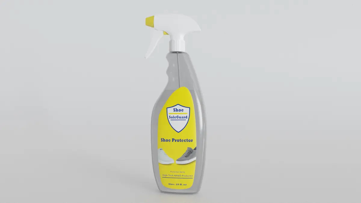 A shoe protector spray in a transparent bottle with a spray nozzle. The packaging showcases a protective shield graphic on a vibrant yellow label with liquid inside.