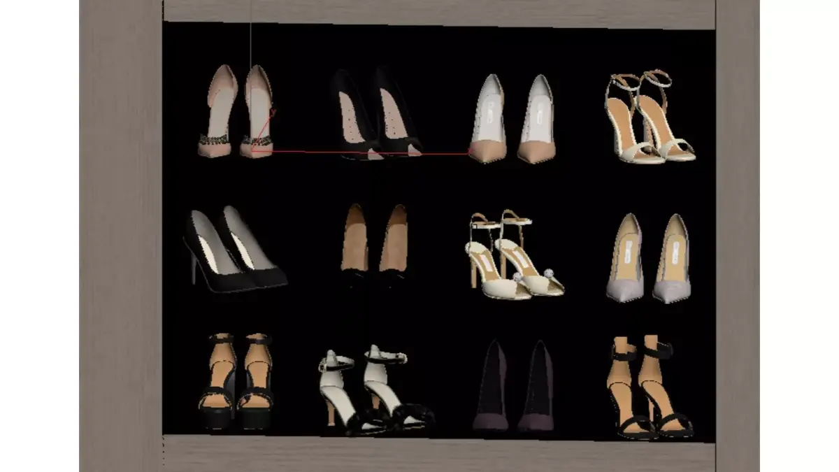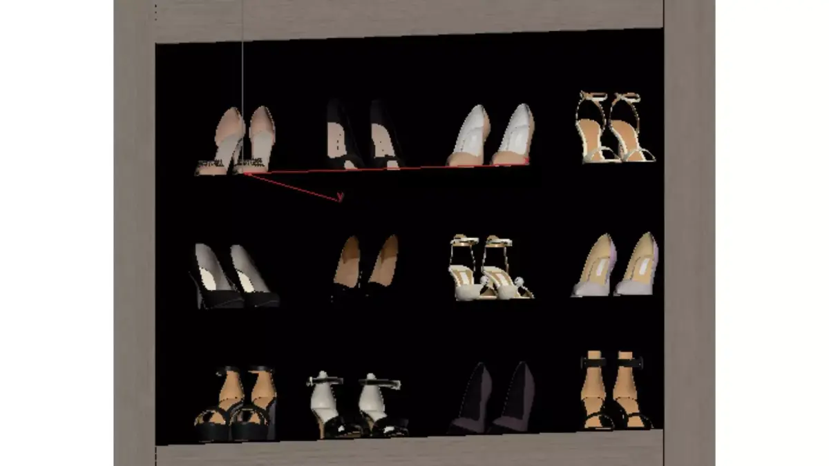 This showcases an exquisite embedded shoe storage cabinet with a modern and textured overall design:Cabinet structure:The light wood colored border is paired with a dark gray lining, and the interior is neatly divided into independent compartments of 3 rows by 4 columns, each equipped with soft LED light strips, creating a high-end display atmosphere.Shoe display:There are multiple pairs of women's high heels neatly arranged in the cabinet, with diverse styles:Classic styles: light pink rhinestone decorated shoes, dark gray metal buckle single shoes, nude pointed slim heels.Sandal styles: white straight strap sandals, black plush decorative sandals, beige thick soled sandals.Featured styles: light gray high heels with sparkling diamond decorations, deep purple satin pointed shoes, etc.All shoes are arranged in pairs, complementing the warm light of the light strip, making it convenient for storage and like a small private shoe museum.Visual experience:The warmth of light wood color contrasts with the stability of dark gray, and the light from the LED strip highlights the texture of the shoes. The overall design balances practicality and aesthetics, conveying a refined and orderly lifestyle.