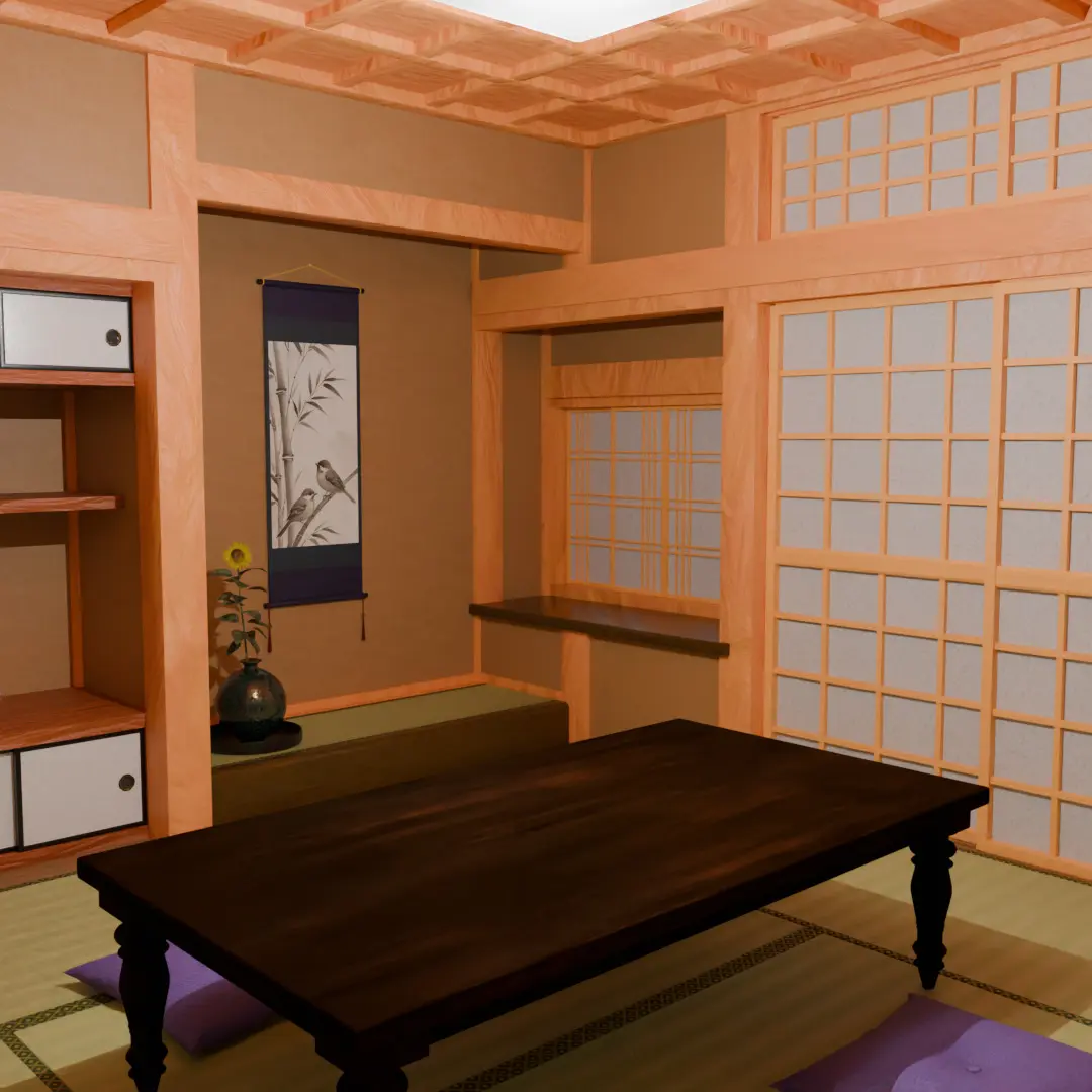 This model is a 3D data for Blender that reproduces a “Shoin-zukuri” Japanese-style room, which symbolizes the aesthetic sense of Japanese architecture. Delicate details such as shoji screens, ranma, tatami mats, hanging scrolls, and tokonoma (alcove) have been carefully modeled to create a high-quality representation of a prestigious Japanese space.