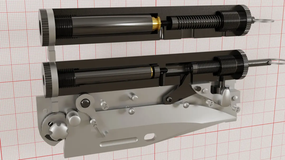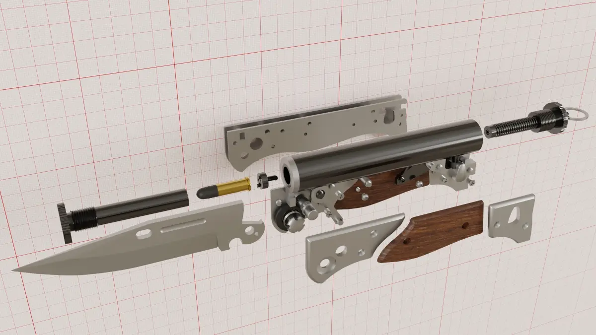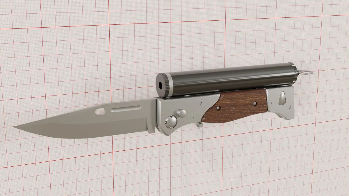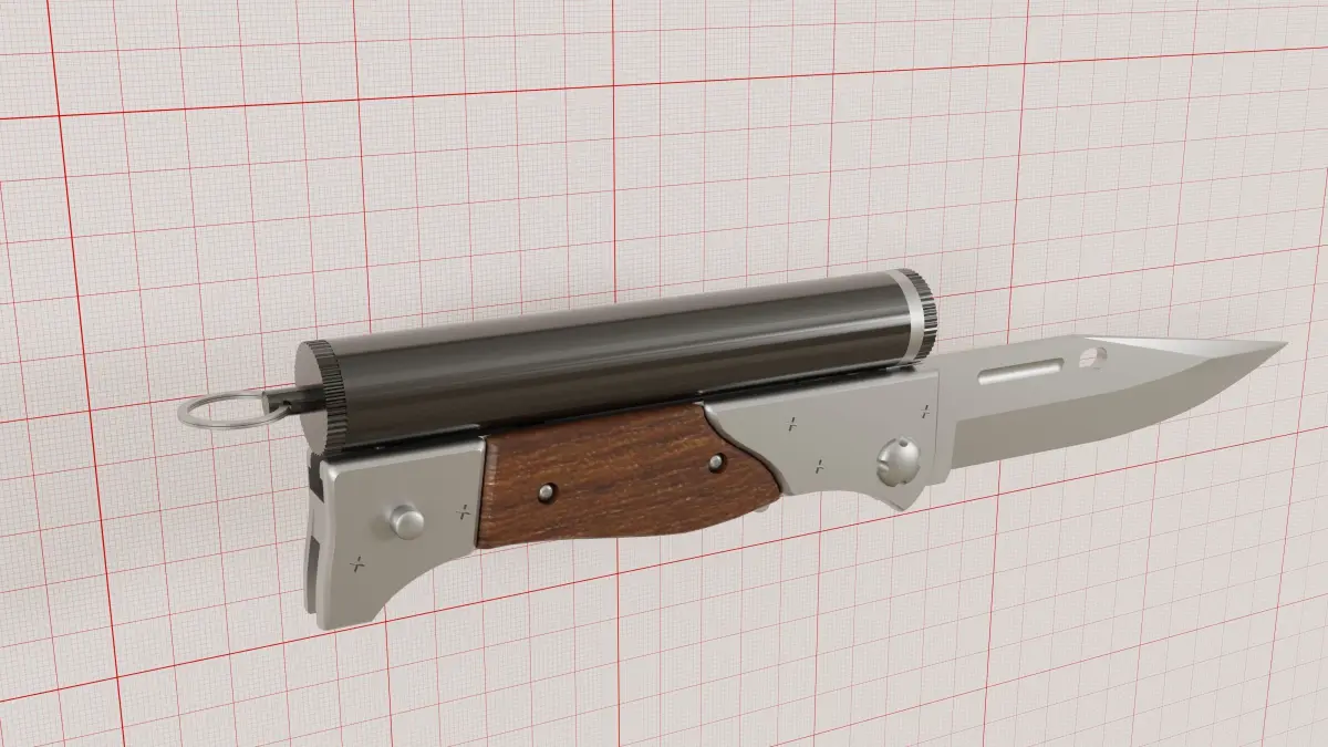 Сlasp-knife АК-47 from Grand Way with .22 or .32 barrel. The shot occurs simultaneously with the ejection of the blade (by pressing the batton) or by pressing the blade.