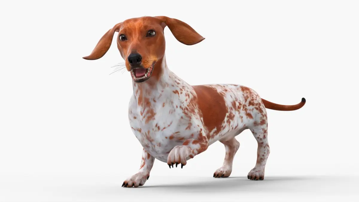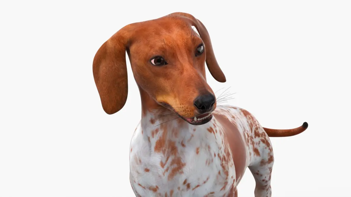 Short-Legged Hound with Dapple Coat Rigged for Cinema 4D is a three-dimensional model of dachshund, a popular breed known for its distinctive long body and short legs, often referred to as a "wiener dog."