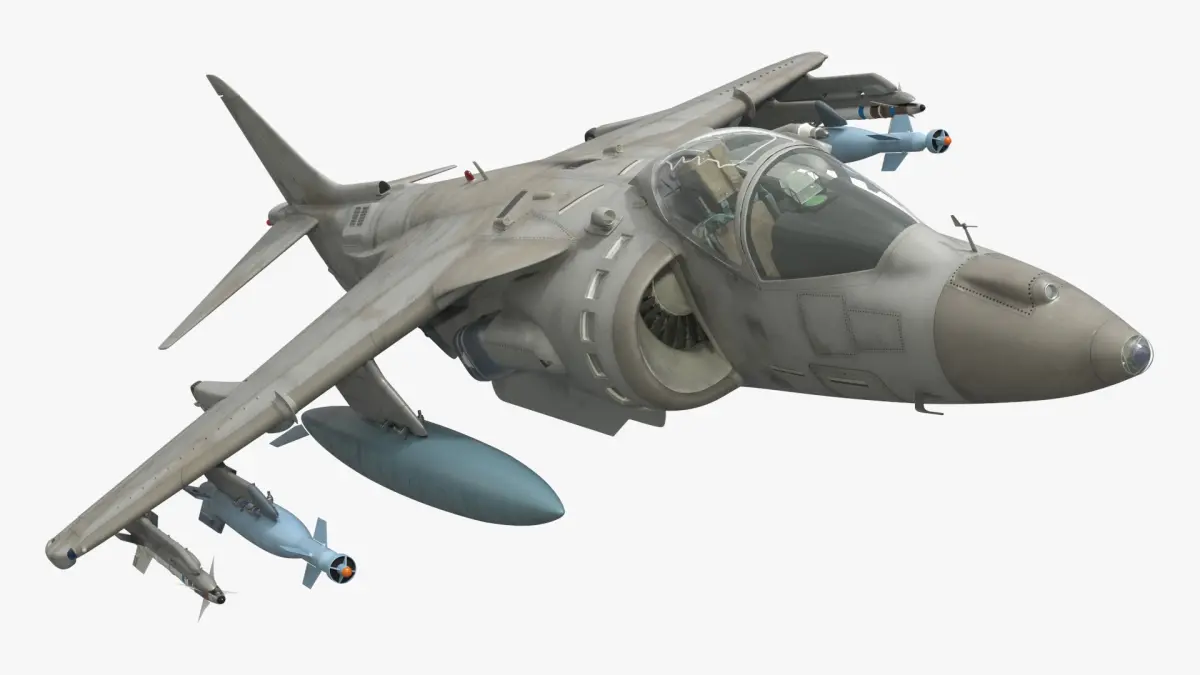 The model showcases the Harrier Jet's distinct design, featuring short wings and a powerful jet engine. It's equipped with rotating nozzles that allow for vertical takeoff and landing, making it ideal for operations in confined spaces. The aircraft is depicted with detailed aerodynamic features and weapon systems for realistic representation.