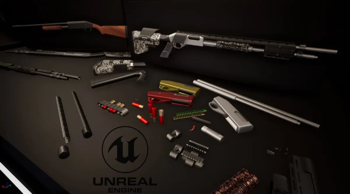 The pack contains 37 parts of shotguns: Body (1), Body parts (ejectors 2 / Trigger 1), Barrel (4), Pump (4), RailBarrel (3), RailBody (1), Stock (5), Sight ), other parts (14). All parts of the weapons are customizable with material instances.