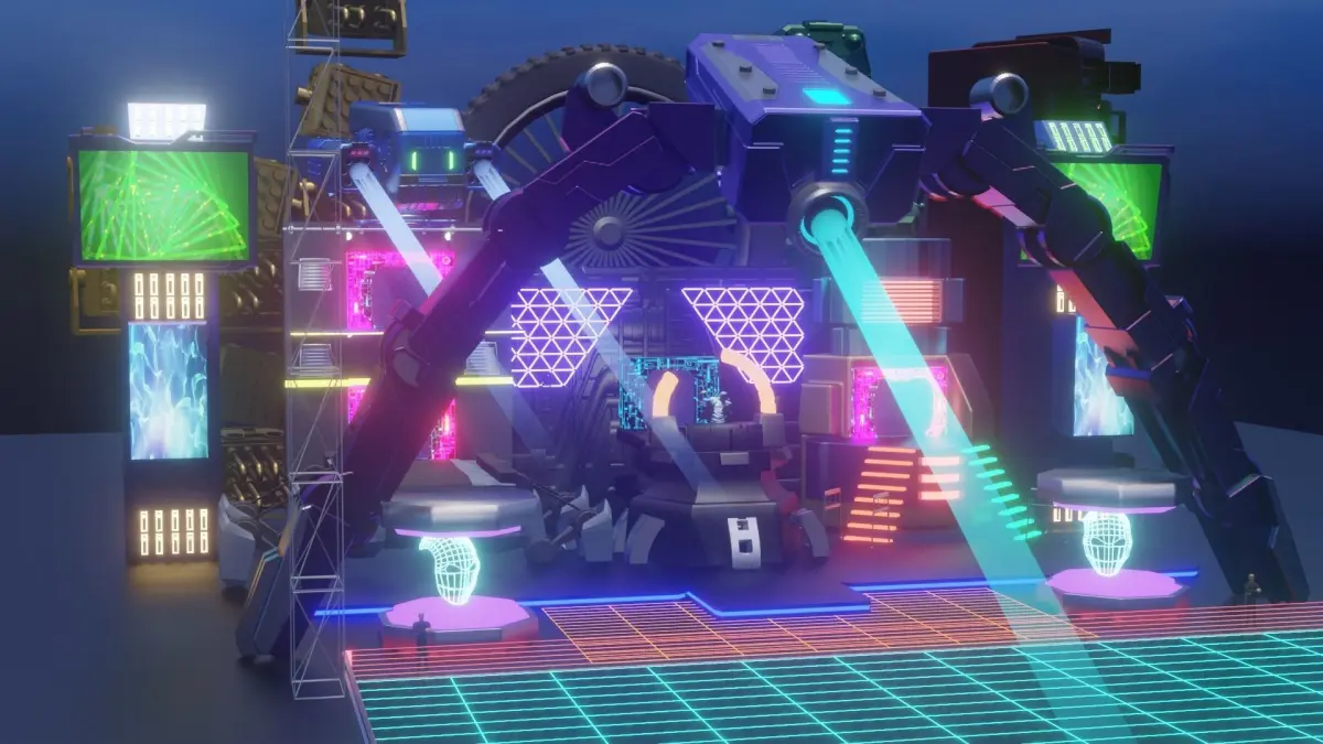 The stage is made for show stage designers or directors who develop show projects. The stage concept is suitable for a sci-fi disco show. The project includes such items as: A robot with laser eyes that can direct light beams, futuristic appearances for artists, a choreography area, a separate area for spectators, an led screen and attached to structures on the sides.