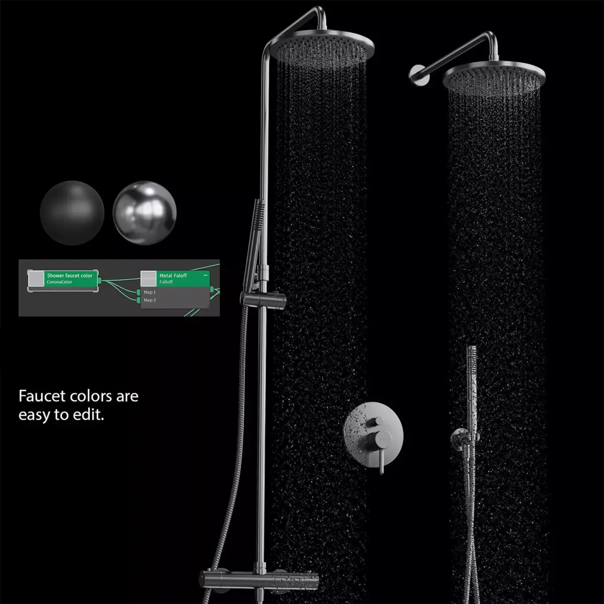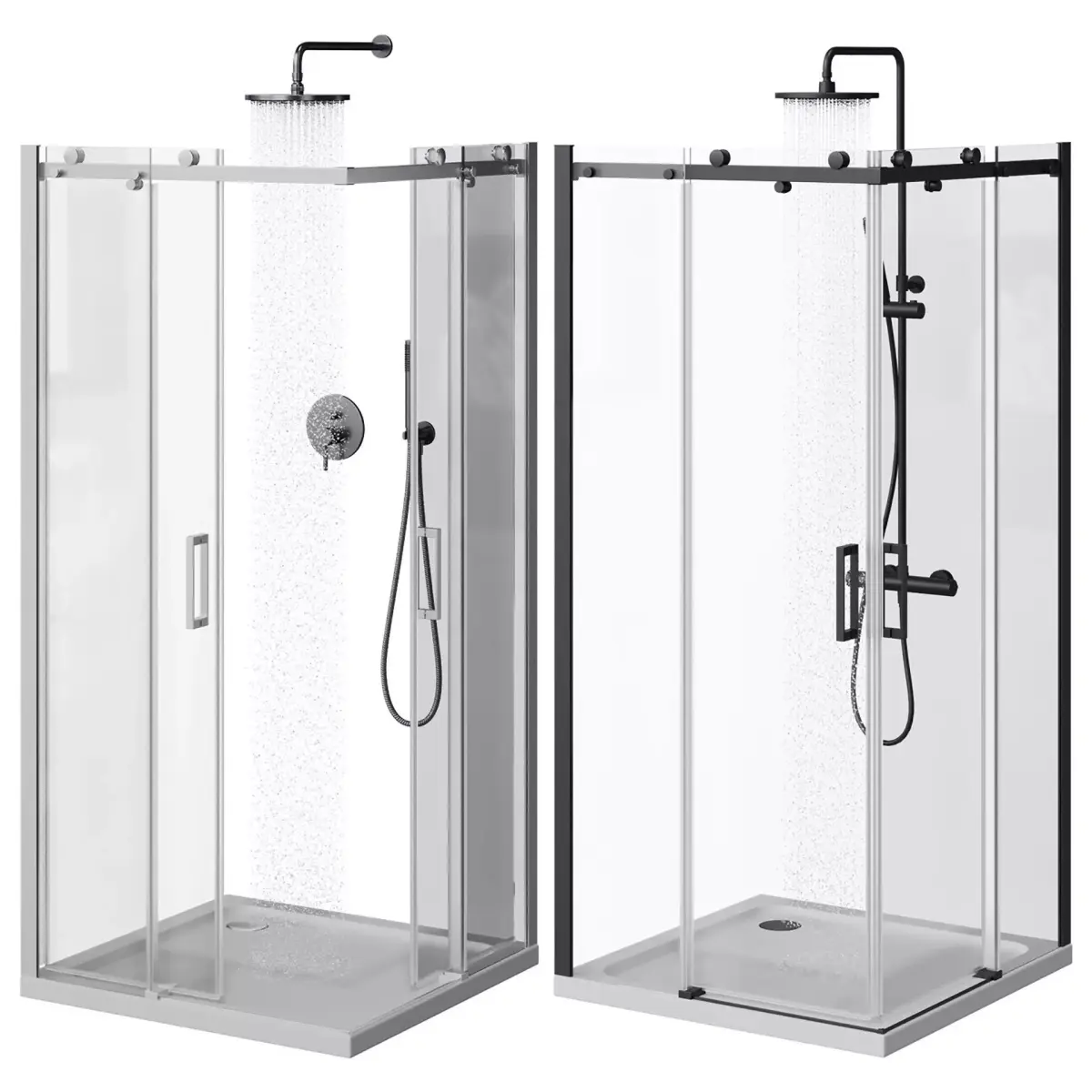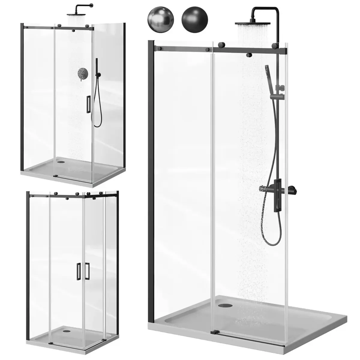 A set of 2 shower nooks and a door to the niche of the Cezares Stylus. 2 colors: chrome and black.The Omnires Y shower set and shower stand are 2 colors: nickel and matt black (the colors of faucets and showers can be easily edited with the CoronaColor card). Drops are made for both mixers.The pivot at the doors is set up, the doors at the showers are easy to open.