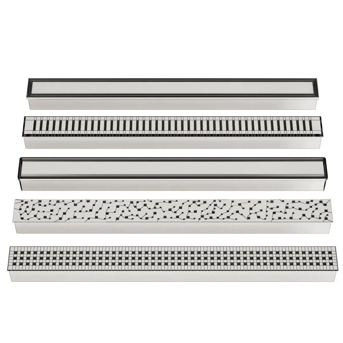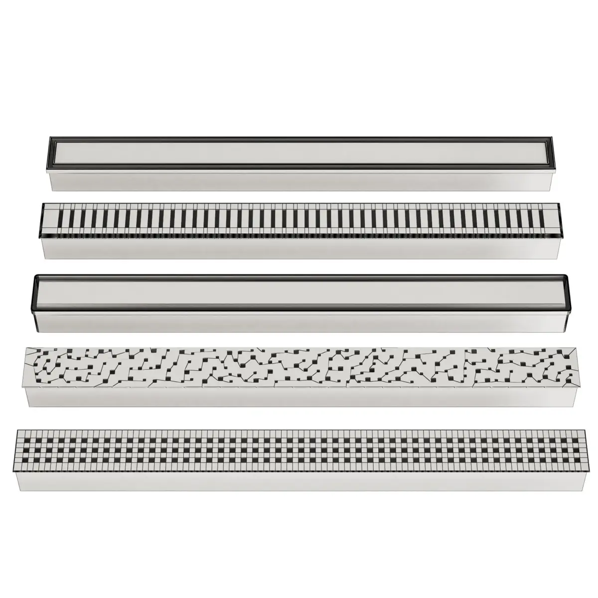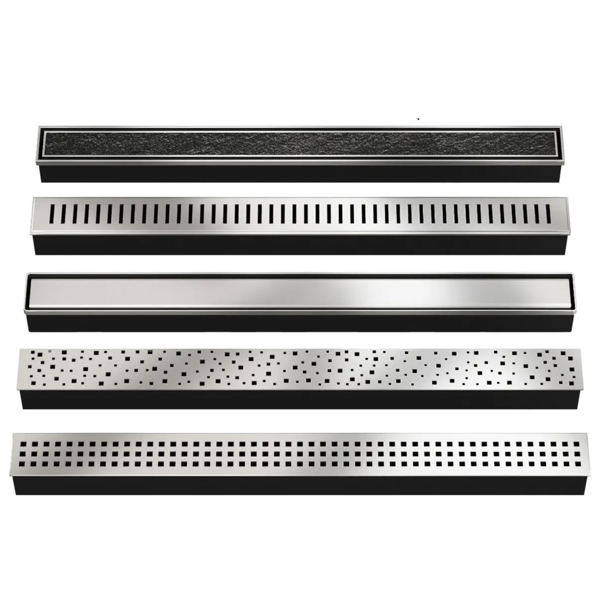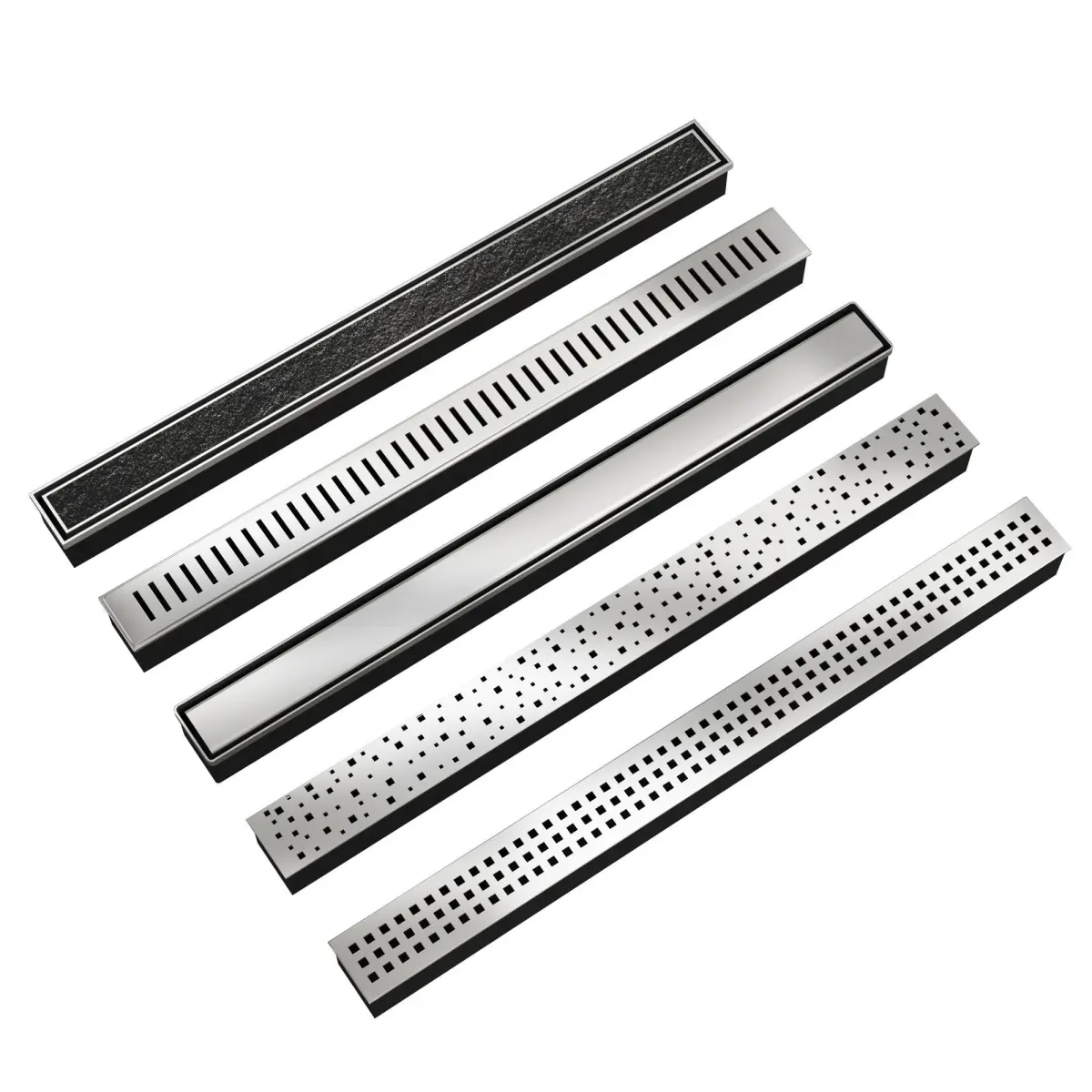 A set of shower drains and a shower floor.Various slot shapesWith overlay tilesLinear, angular, square