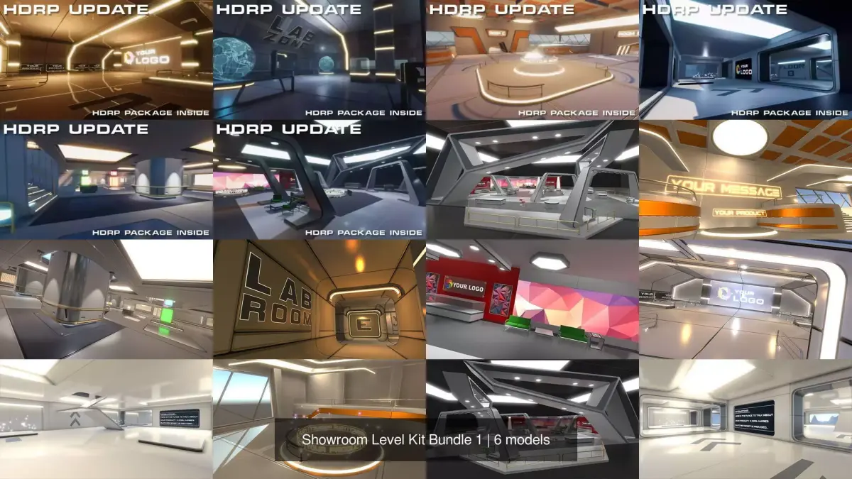Get 6 complete modular showroom kits in a single package. Each volume is a standalone interior environment, fully modular, fully customizable, ready to use out of the box.